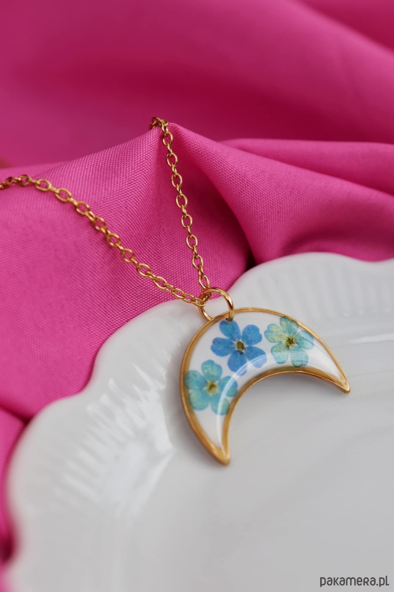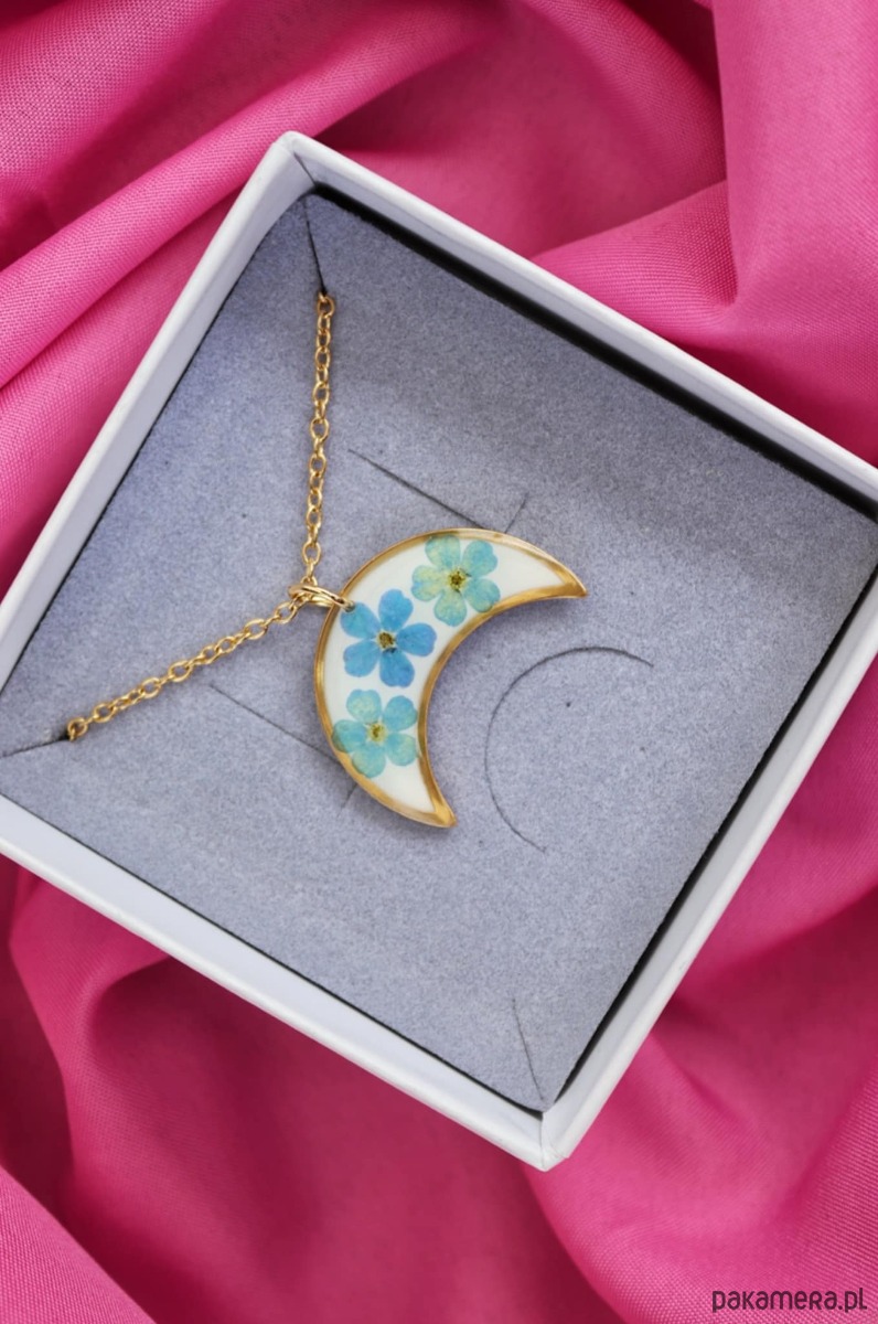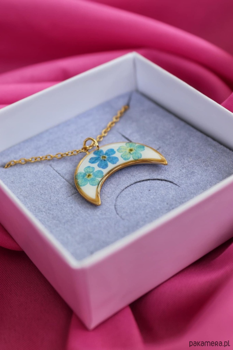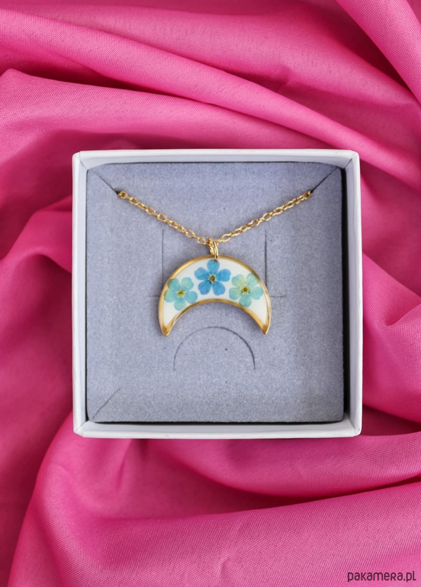 Naszyjnik z kwiatami suszonej niezapominajki to unikatowa, ręcznie wykonana biżuteria z serii Wdzięczność.
