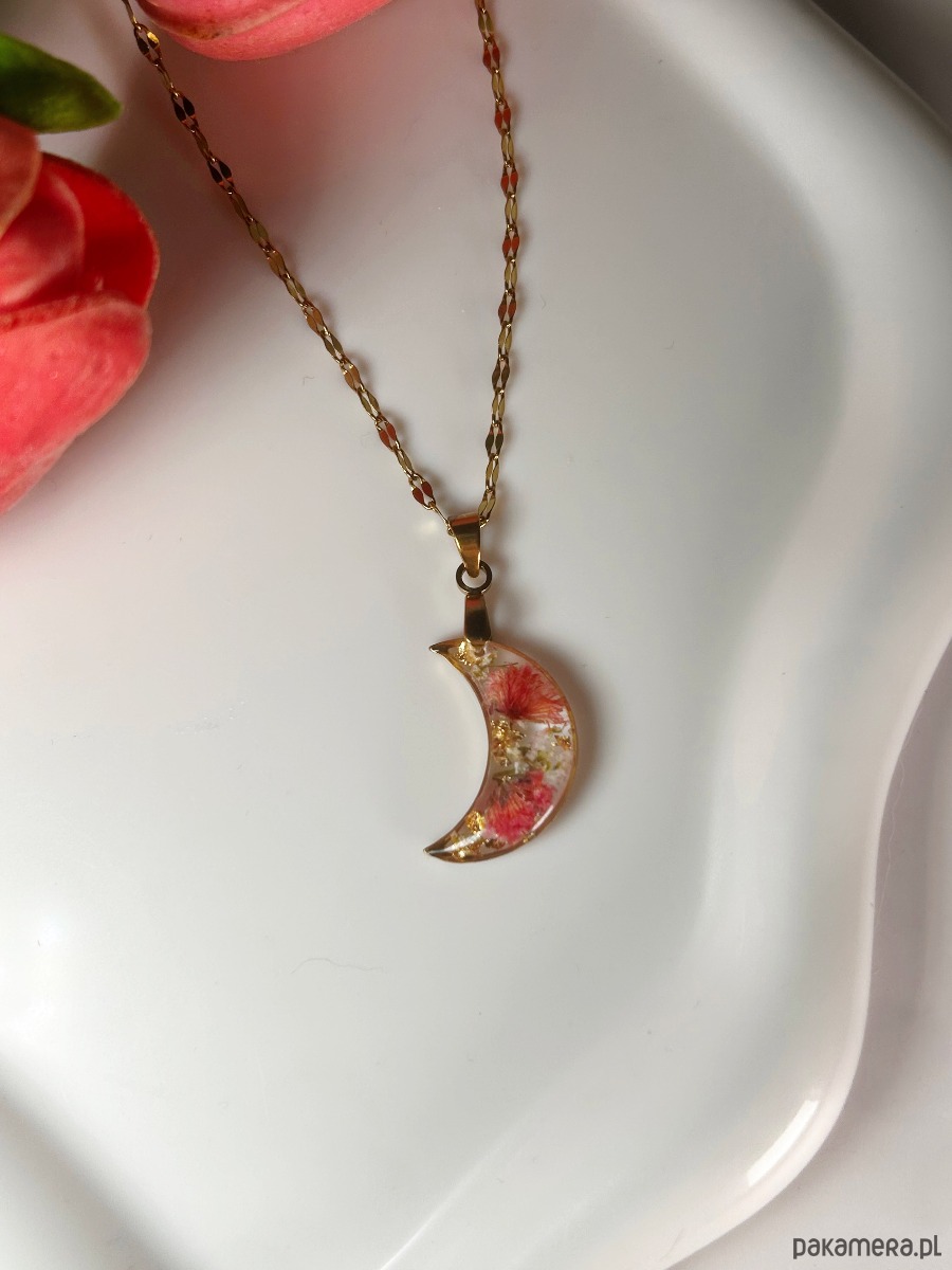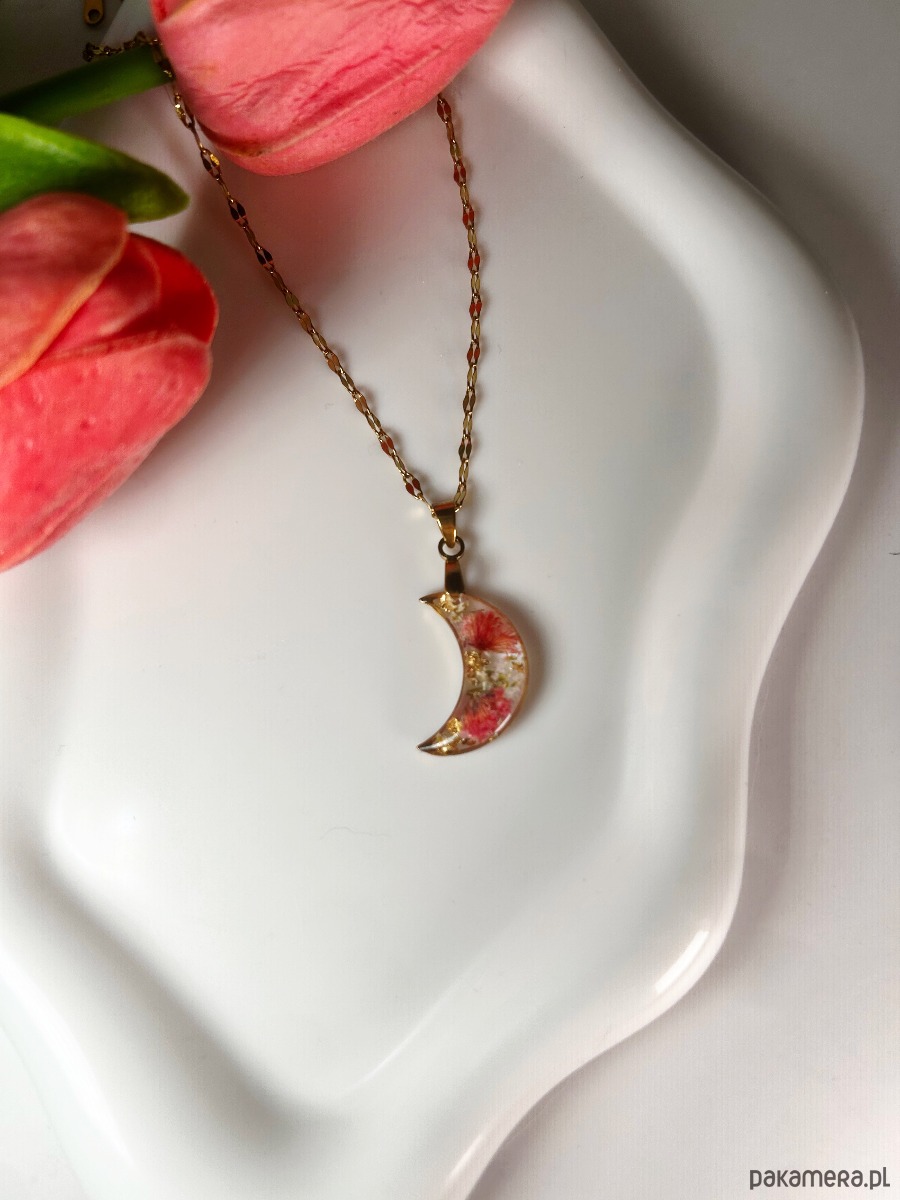 Delikatny, złoty naszyjnik z zawieszką w kształcie księżyca. Wnętrze wypełnione prawdziwymi kwiatami i płatkami złota zatopionymi w krystalicznej żywicy. Elegancja inspirowana naturą.