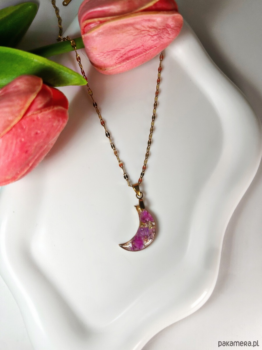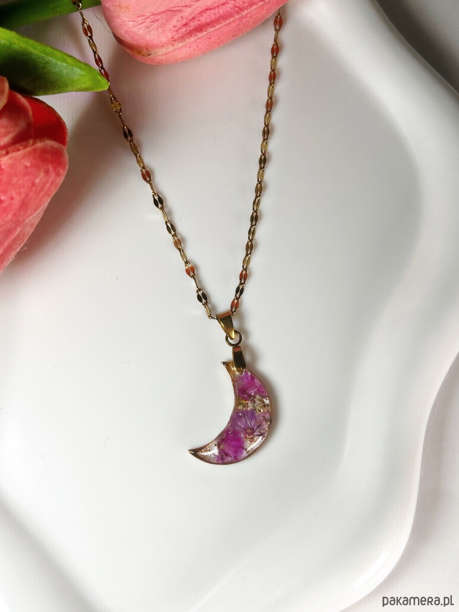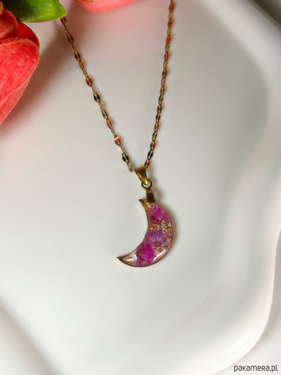 Naszyjnik księżyc z różowymi kwiatami Biżuteria z kwiatami