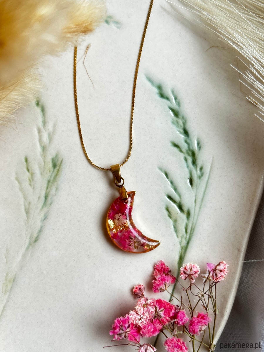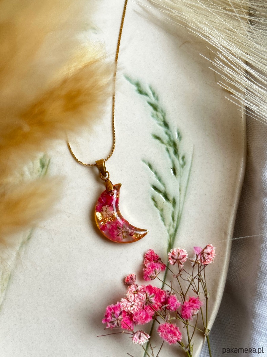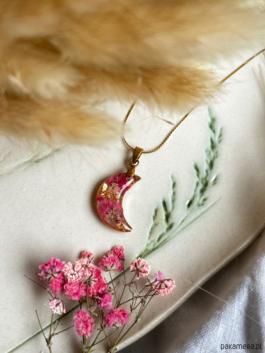 Ten uroczy naszyjnik w kształcie półksiężyca został wykonany z prawdziwych, różowych kwiatuszków zatopionych w krystalicznej żywicy i wykończony złotymi akcentami, które pięknie odbijają światło. To mały talizman pełen delikatności, ciepła i naturalnego uroku.