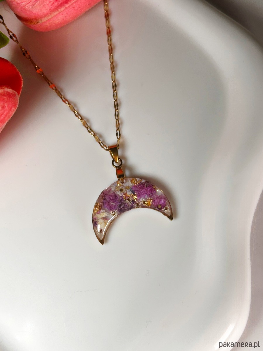 Naszyjnik księżyc z różowymi kwiatami Biżuteria z kwiatami