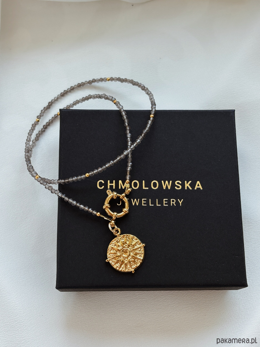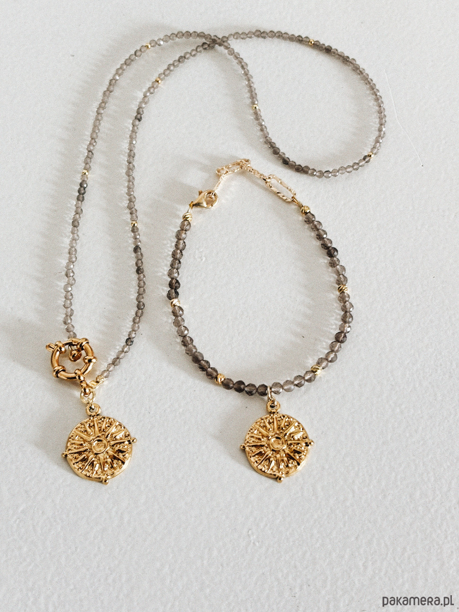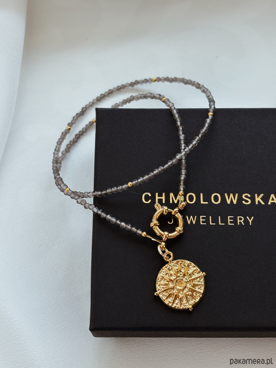 Naszyjnik wykonany jest na lince jubilerskiej z Kwarcu Dymnego, zawieszki rodowanej złotem z różą wiatrów oraz zapięciem ze stali ch.