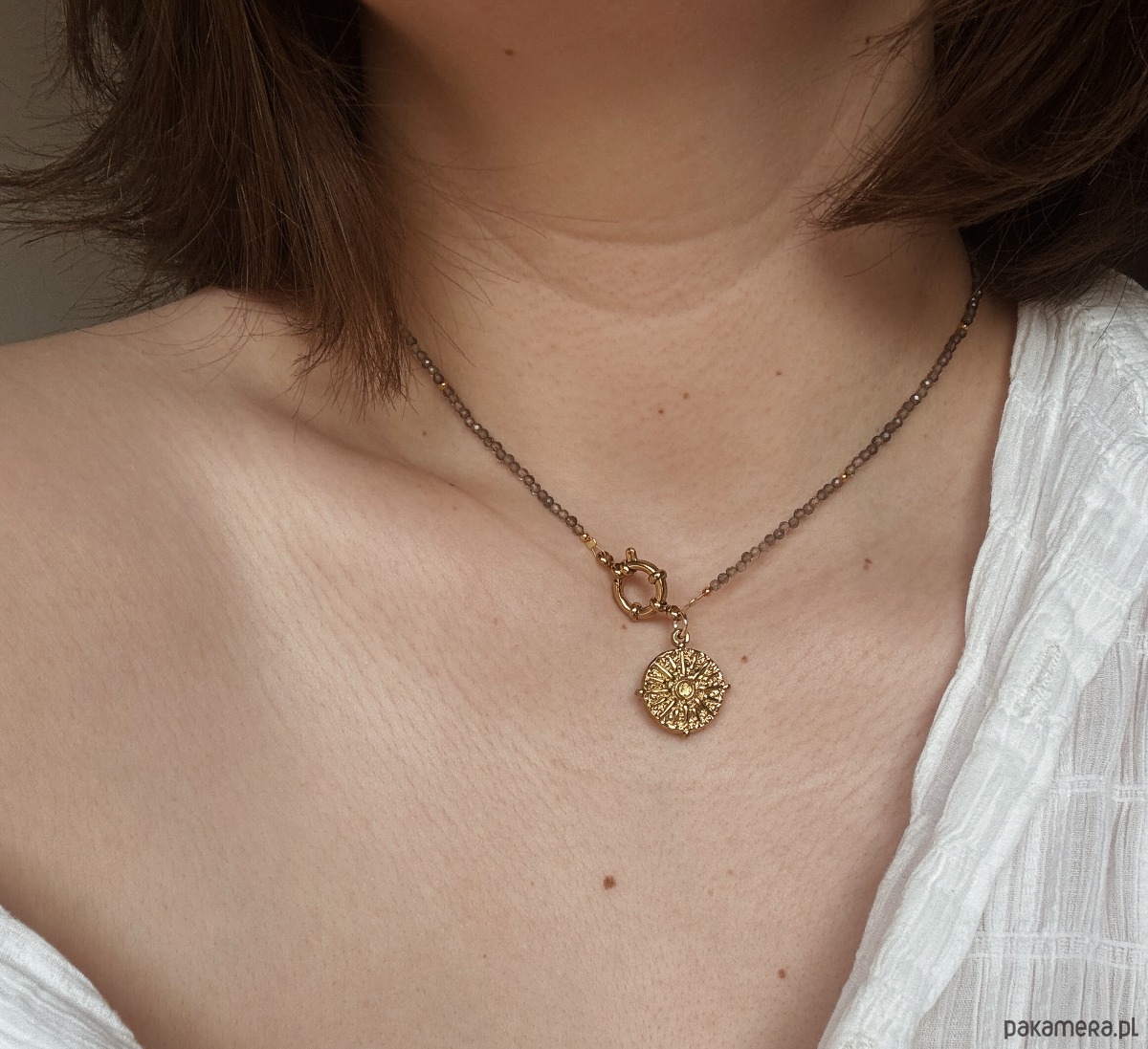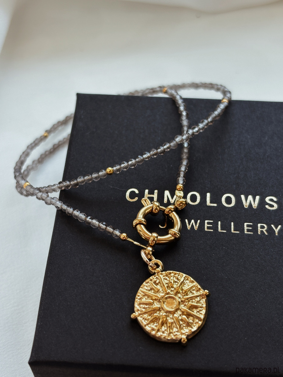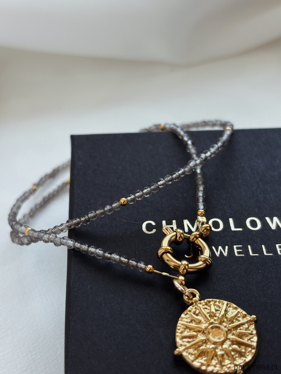 Naszyjnik wykonany jest na lince jubilerskiej z Kwarcu Dymnego, zawieszki rodowanej złotem z różą wiatrów oraz zapięciem ze stali ch.