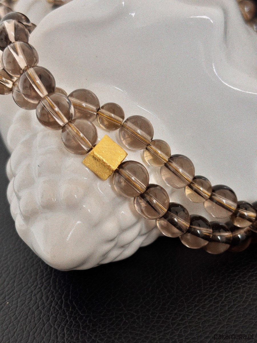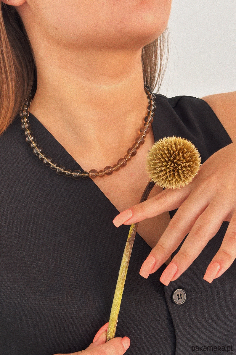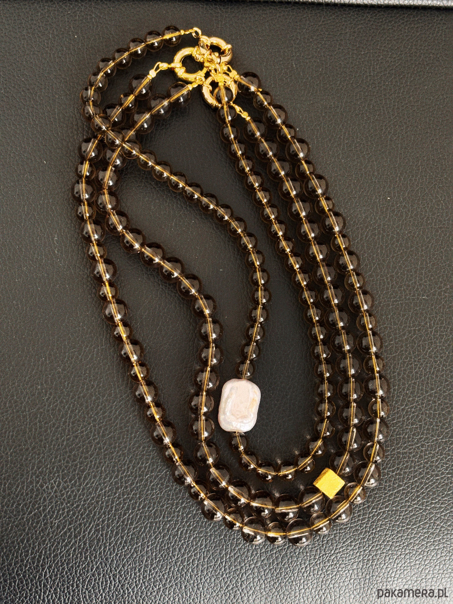 Naszyjnik wykonany jest na lince jubilerskiej z użyciem kwarcu dymnego i zapięcia z mosiądzu- pozłacanego.