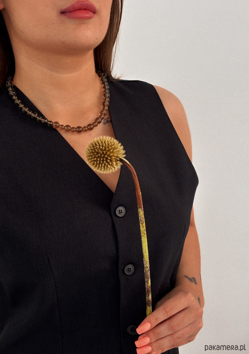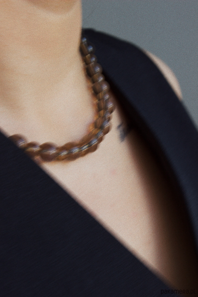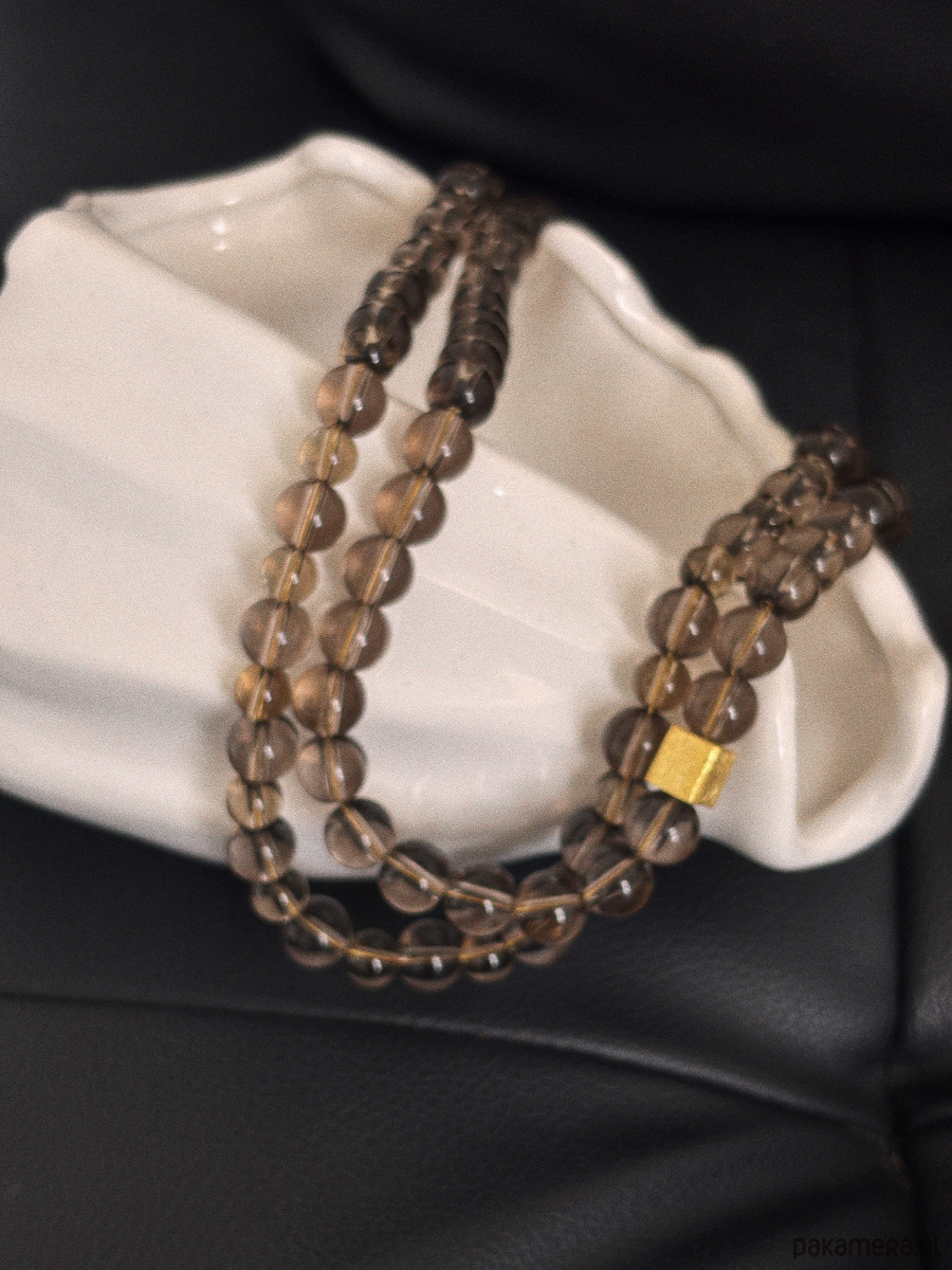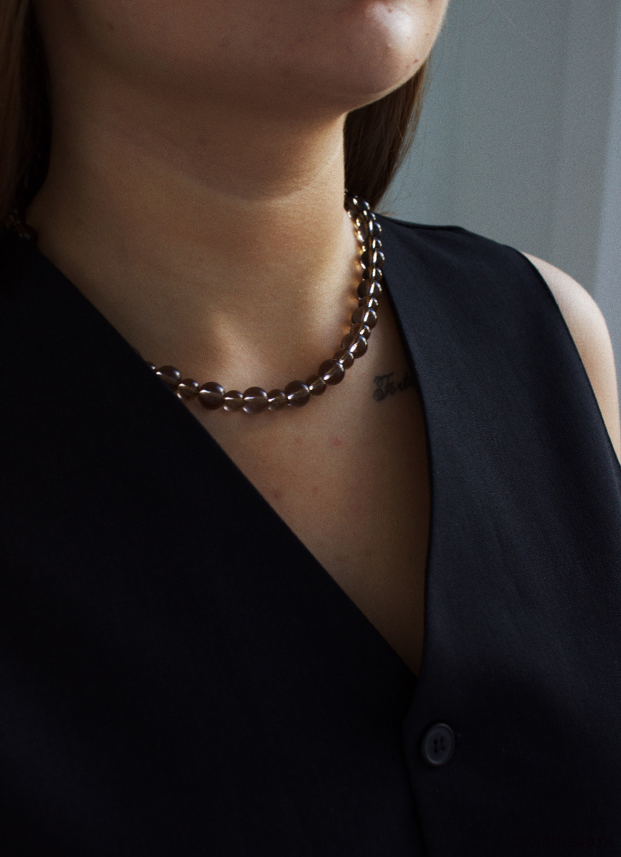 Naszyjnik wykonany jest na lince jubilerskiej z użyciem kwarcu dymnego i zapięcia z mosiądzu- pozłacanego.