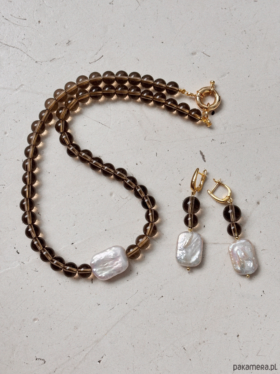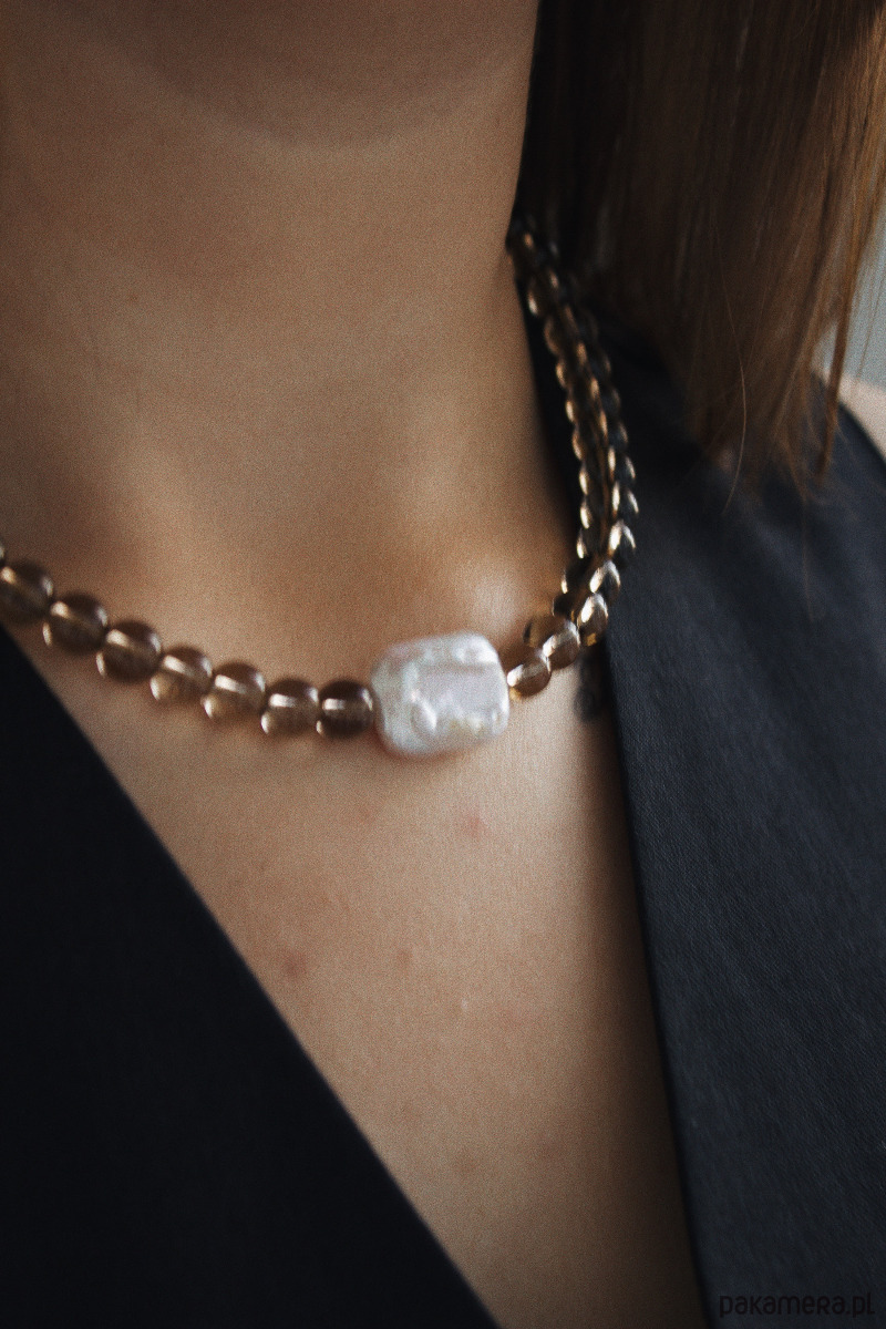 Naszyjnik wykonany jest na lince jubilerskiej z użyciem kwarcu dymnego, unikatowej perły w kwadratowym kształcie i zapięcia z mosiądzu- pozłacanego.