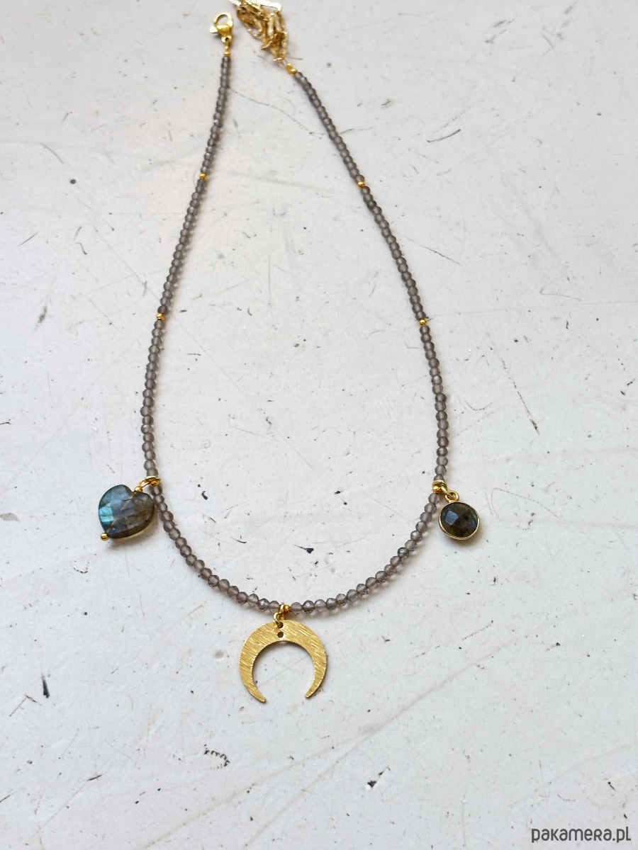 Naszyjnik wykonany jest na lince jubilerskiej z użyciem kwarcu dymnego, zawieszek z labradorytem i księżyca.