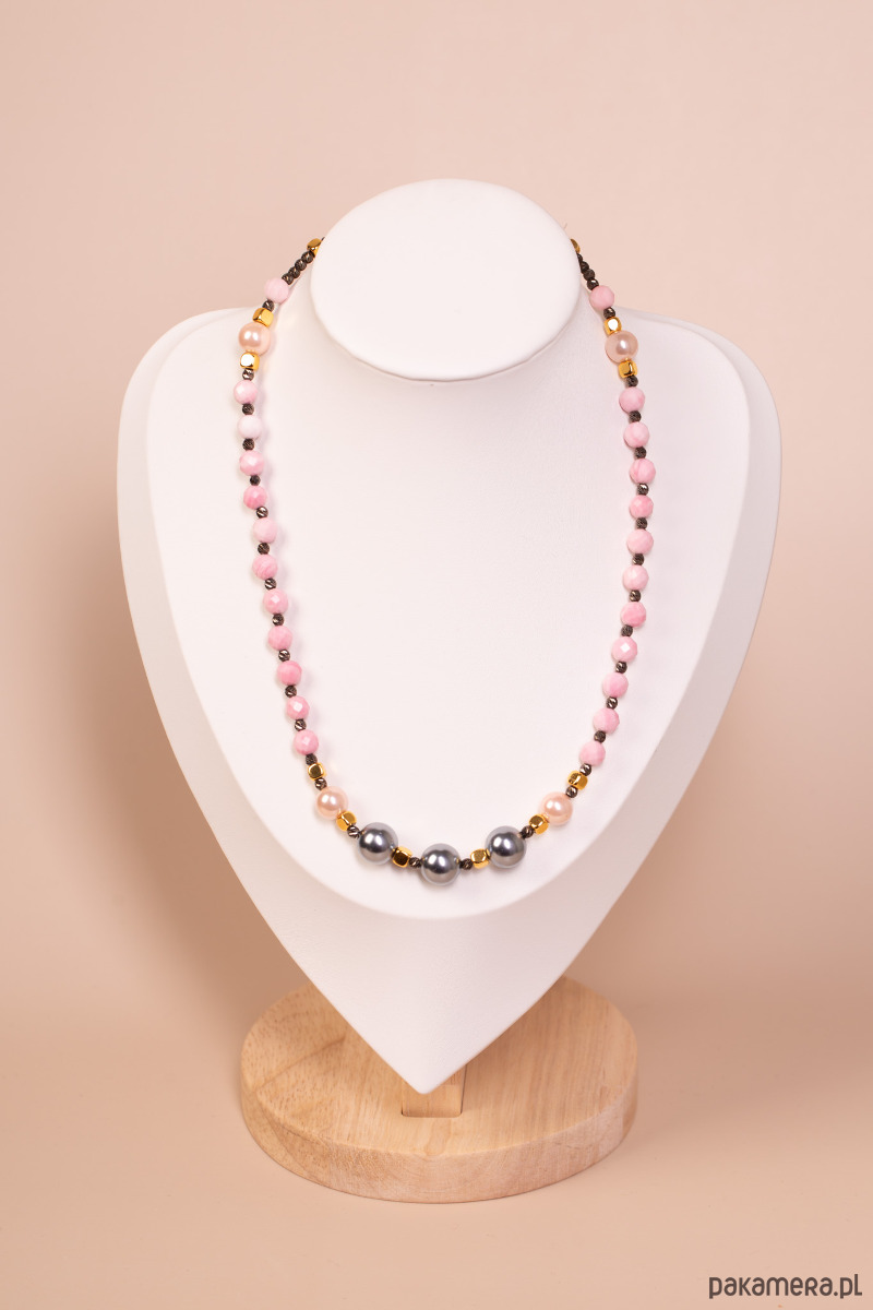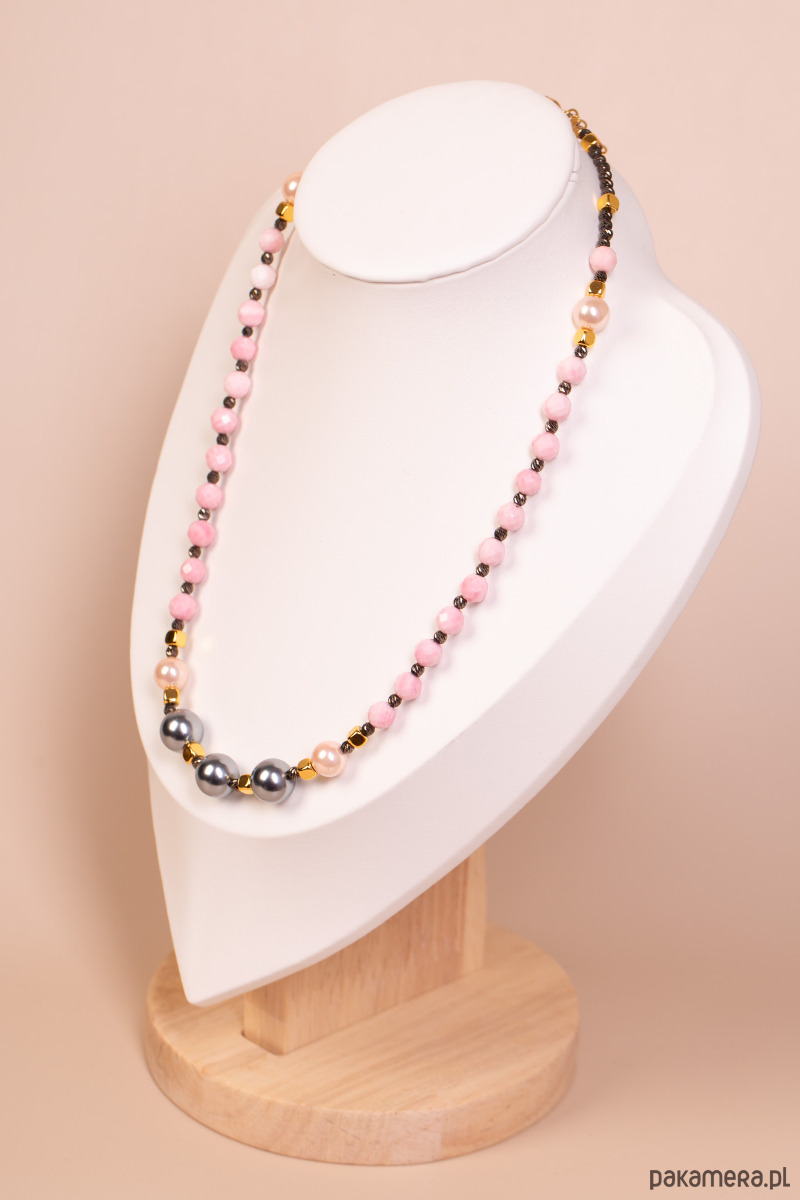 Subtelny, ręcznie wykonany naszyjnik na stalowej lince, będący pochwałą kobiecości i delikatności. Główną linię tworzą fasetowane kuleczki rodochrozytu o pięknym, pudrowo-różowym odcieniu. W centralnej części kompozycji umieszczono trzy okazałe perły w głębokim, stalowym kolorze, które sąsiadują z klasycznymi, jasnymi perłami hodowlanymi. Całość dopełniają złociste akcenty hematytu oraz pozłacane elementy ze srebra próby 925.