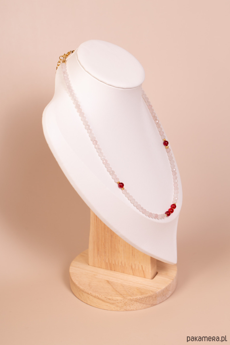 Delikatny, ręcznie wykonany naszyjnik na stalowej lince, będący połączeniem eterycznej jasności i ognistego akcentu. Główną linię tworzą drobne, fasetowane kuleczki kwarcu różowego o wysokiej przejrzystości, które subtelnie mienią się przy każdym ruchu. Tę łagodną kompozycję przełamują koraliki intensywnie czerwonego, barwionego bursztynu bałtyckiego, nadając biżuterii wyrazistego charakteru.