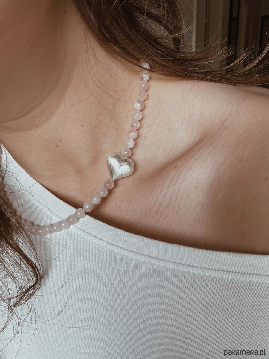 Naszyjnik wykonany jest na lince jubilerskiej z użyciem kwarcu różowego i zawieszki serca ze srebra, a także zapięcia i łańcuszka.