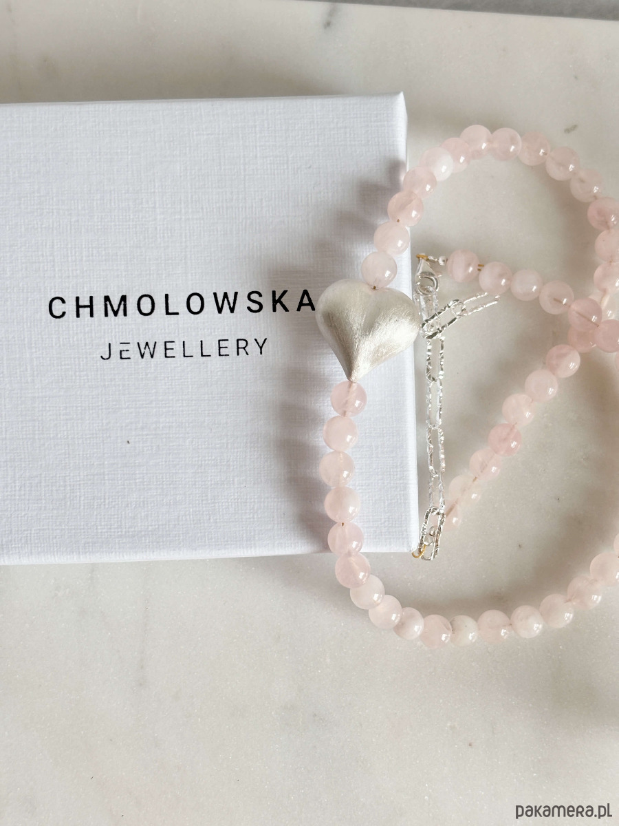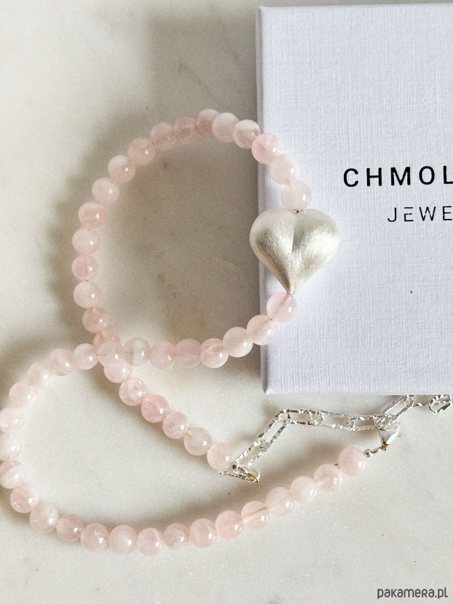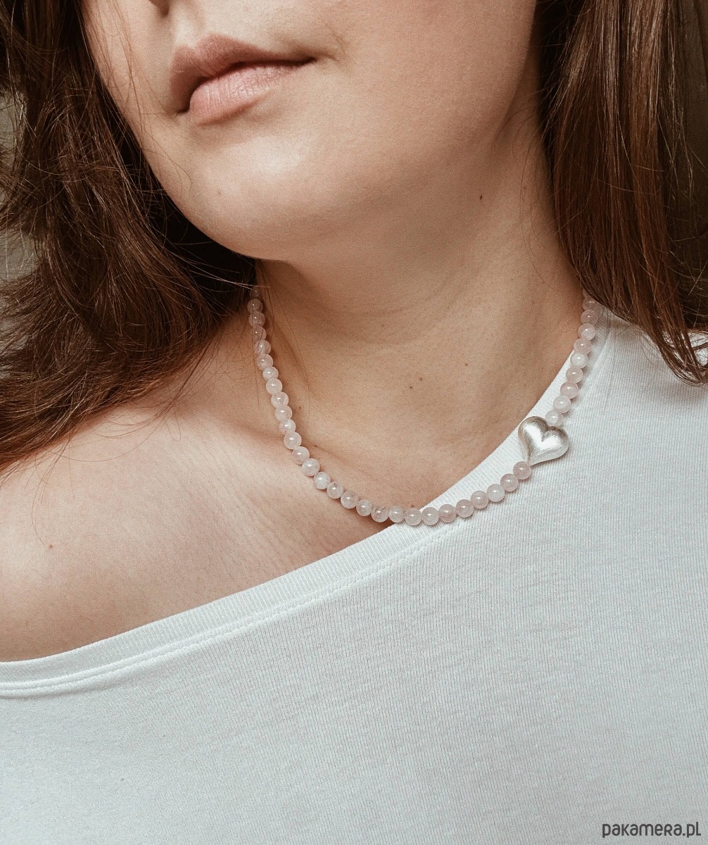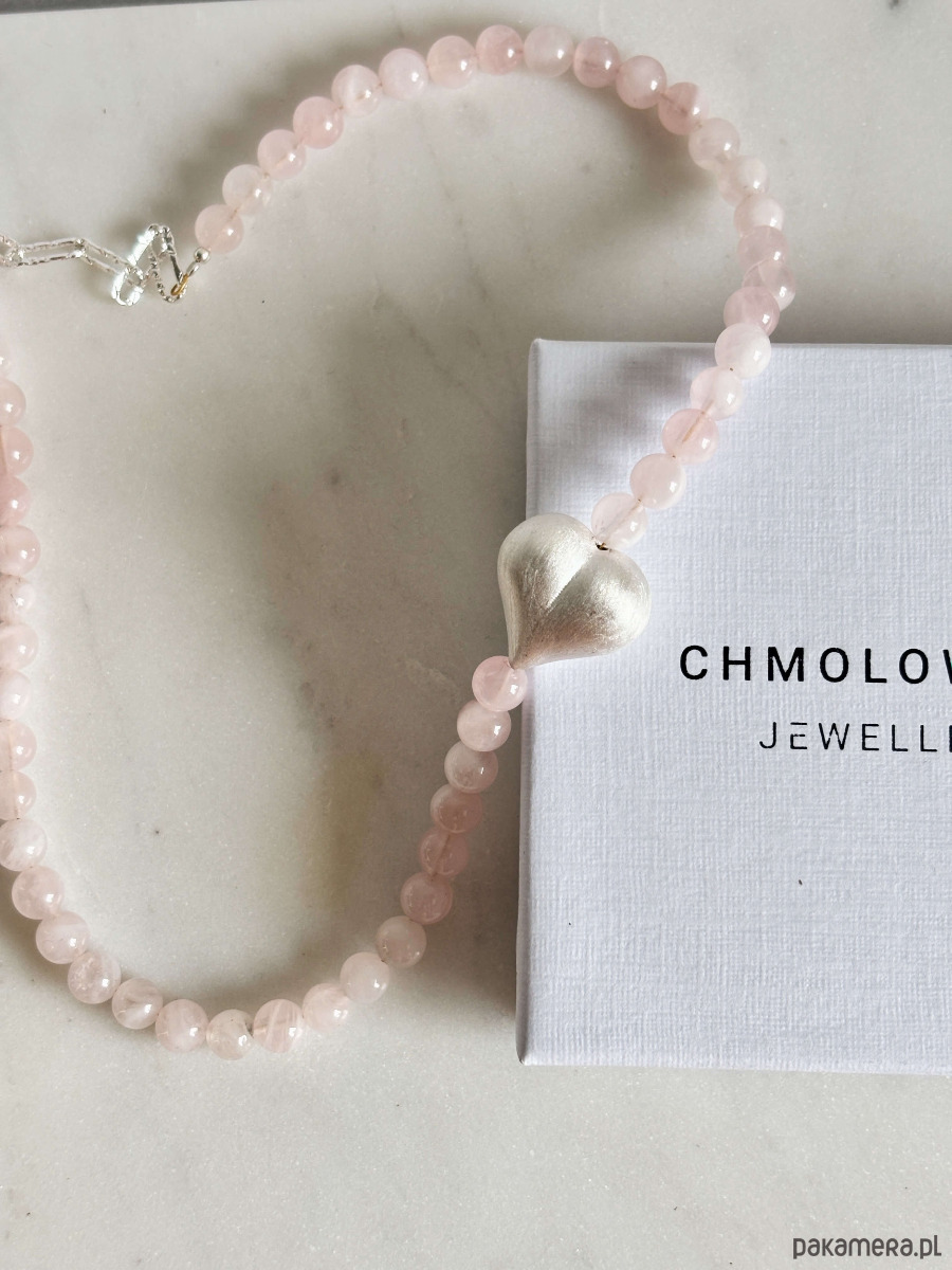 Naszyjnik wykonany jest na lince jubilerskiej z użyciem kwarcu różowego i zawieszki serca ze srebra, a także zapięcia i łańcuszka.