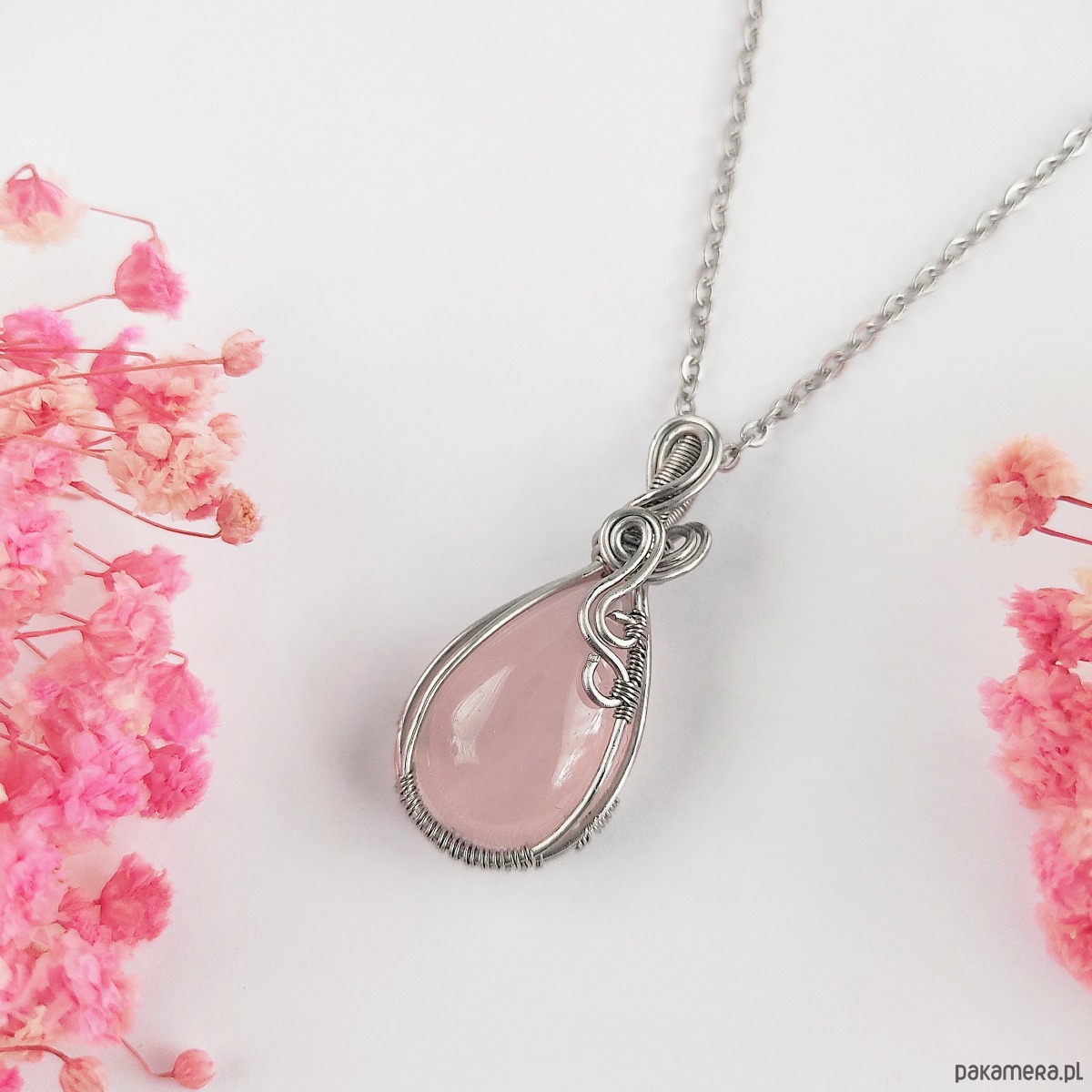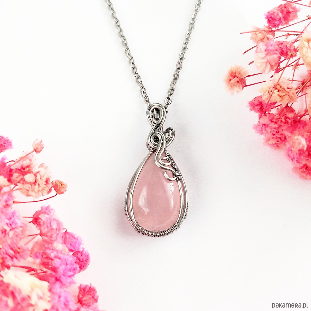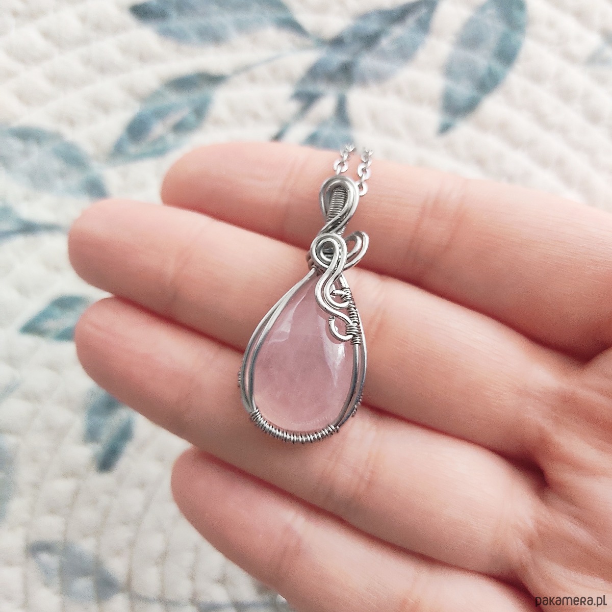 Naszyjnik Kwarc Różowy ręcznie robiony. Wykonany techniką wire wrapping z drutów ze stali chirurgicznej.