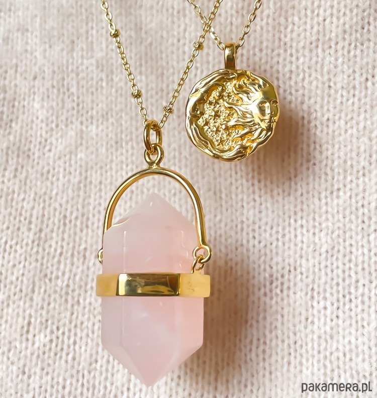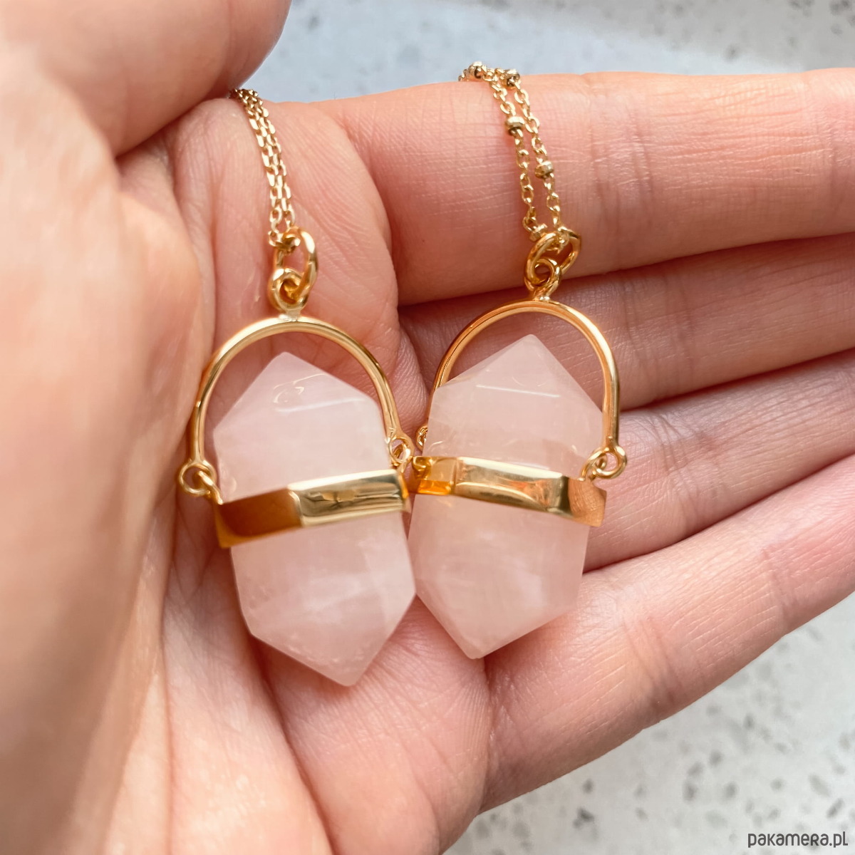 Naszyjnik kwarc różowy w oprawie. Każda sztuka została wykonana ręcznie. Kryształy zostały okute w srebro próby 925, a następnie pozłacane . Kamienie mogą różnić się wielkością oraz posiadać nierówności i mikro rysy - jest to naturalne przy kamieniu naturalnym.