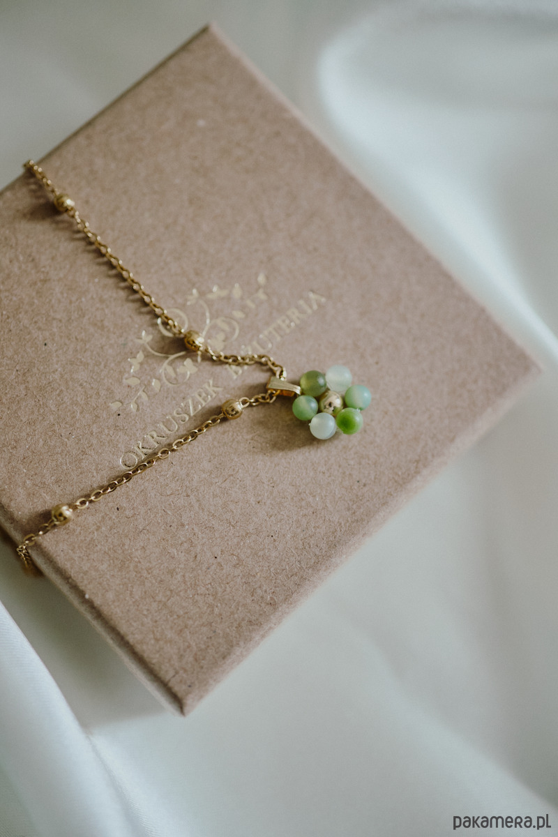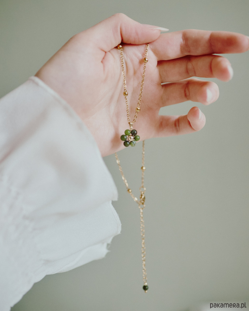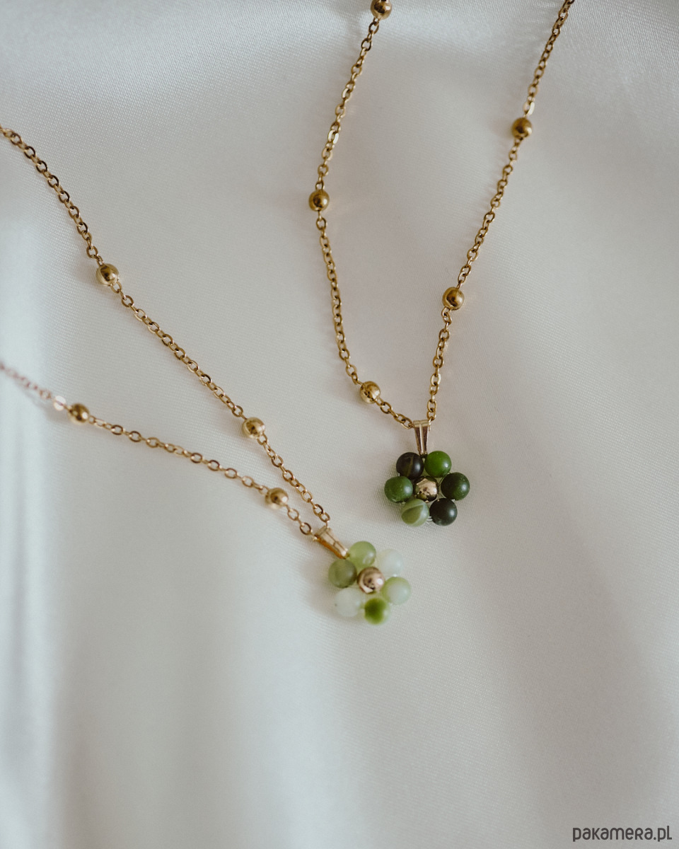 Naszyjnik z kwiatem wykonanym z zielonego agatu. Łańcuszek ozdobiony kuleczkami.