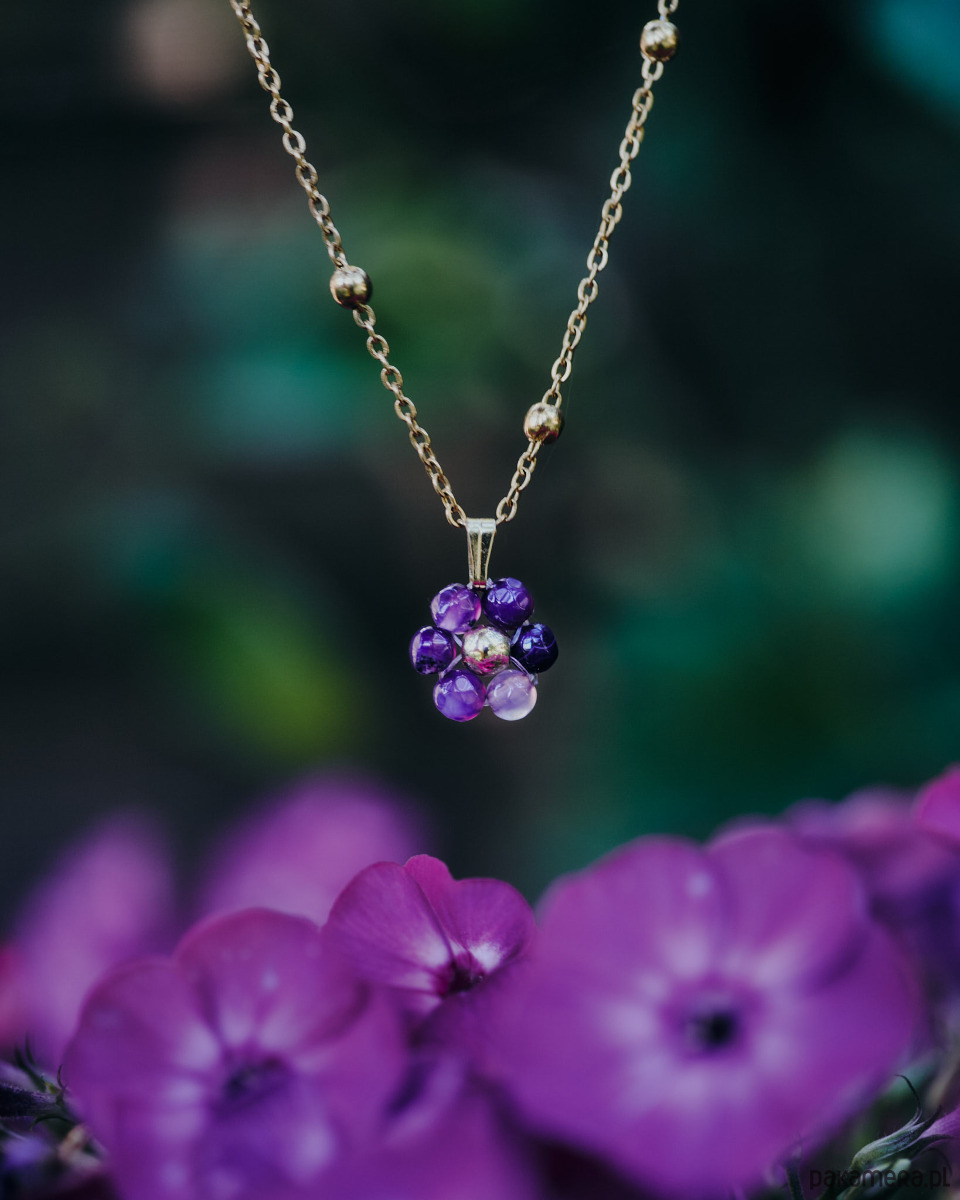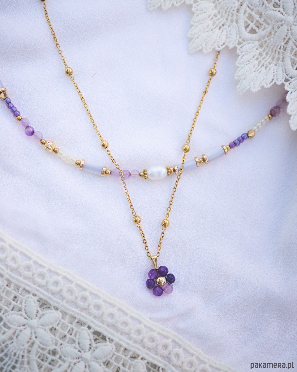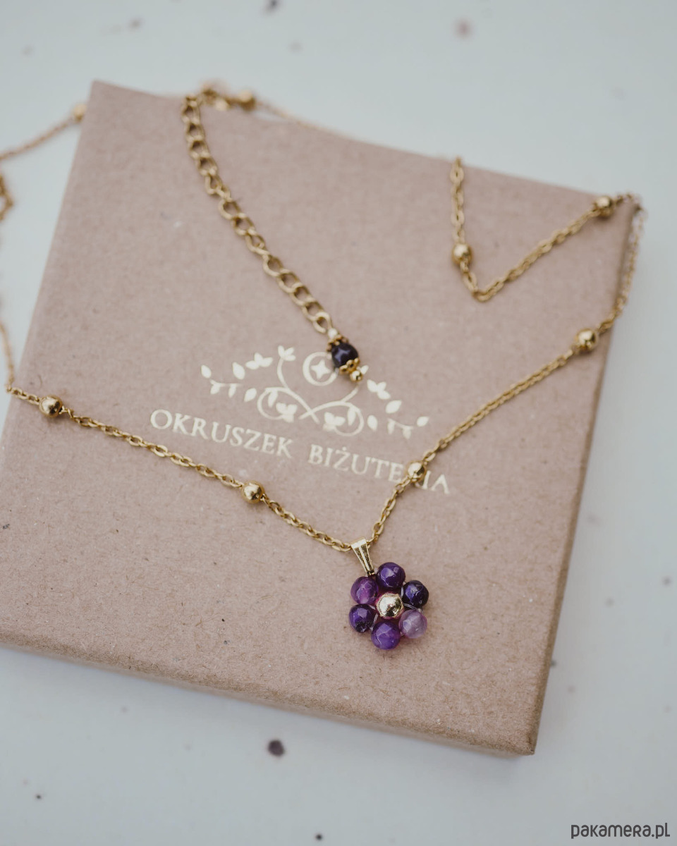 Naszyjnik z kwiatem wykonanym z fioletowego agatu. Łańcuszek ozdobiony kuleczkami.