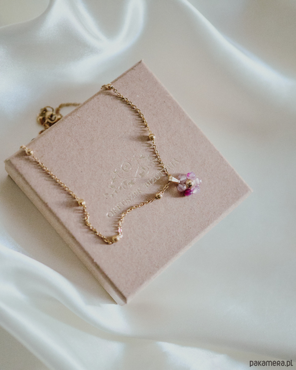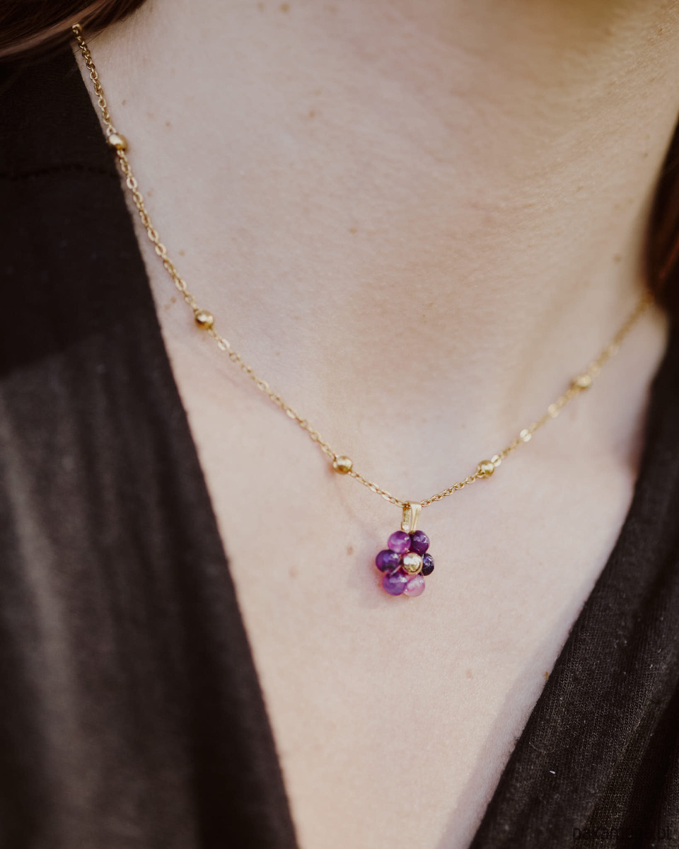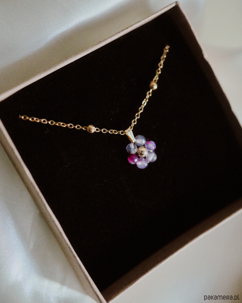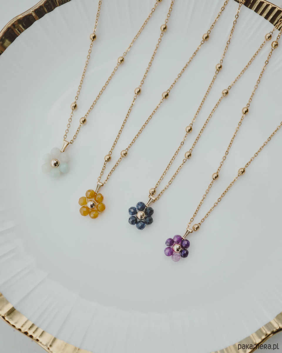 Naszyjnik z kwiatem wykonanym z fioletowego agatu. Łańcuszek ozdobiony kuleczkami.
