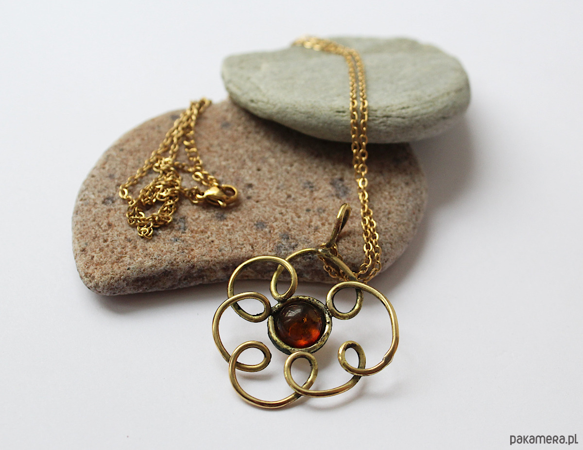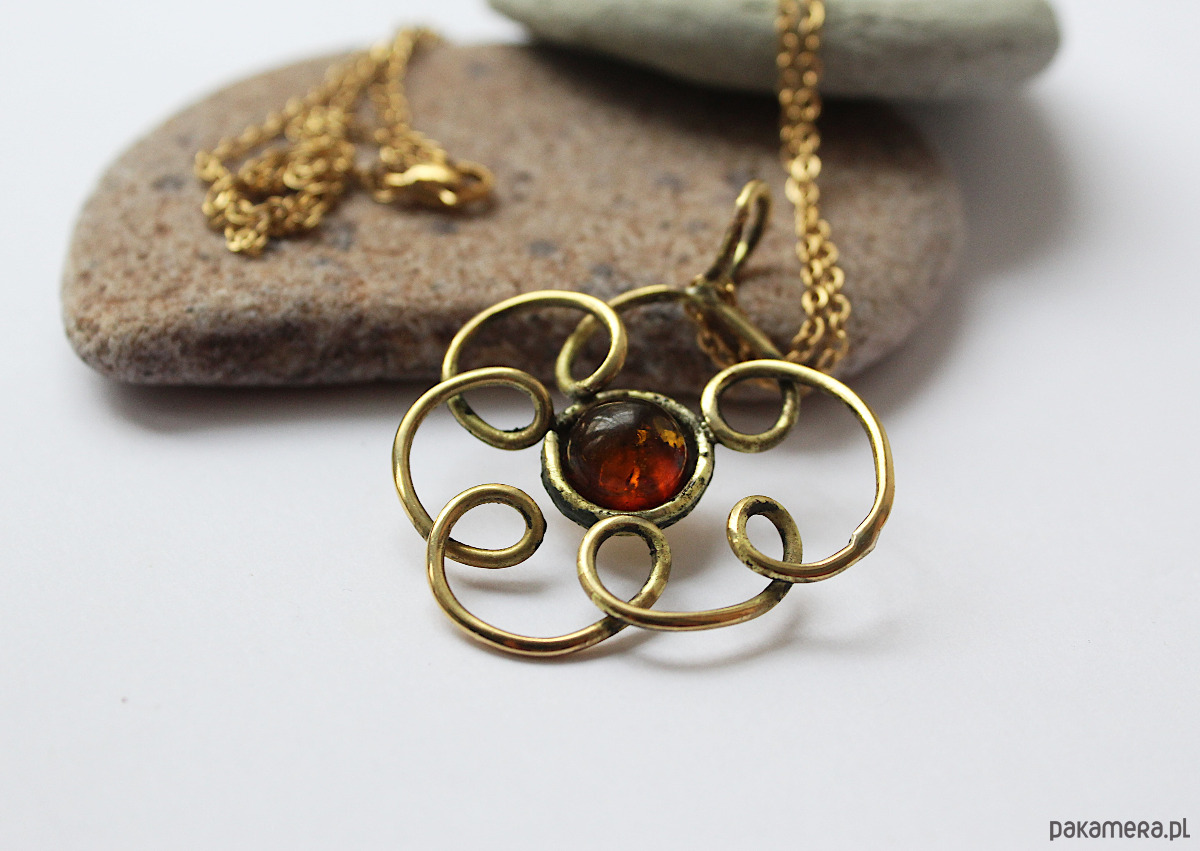 Naszyjnik z ręcznie wykonaną zawieszką z mosiądzu w kształcie kwiatka, której sercem jest oprawiony bursztyn Bałtycki.