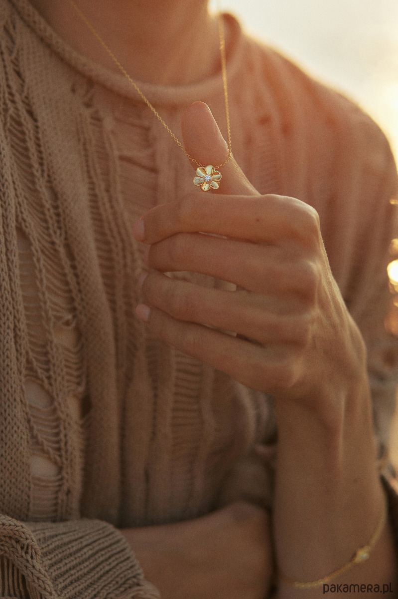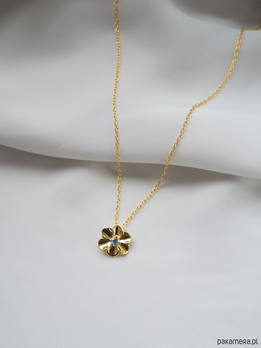 Naszyjnik z motywem kwiatu z dodatkiem błękitnej cyrkonii. Wykonany ze srebra o próbie 925 pozłacany 24- karatowym złotem. Posiada regulacje.