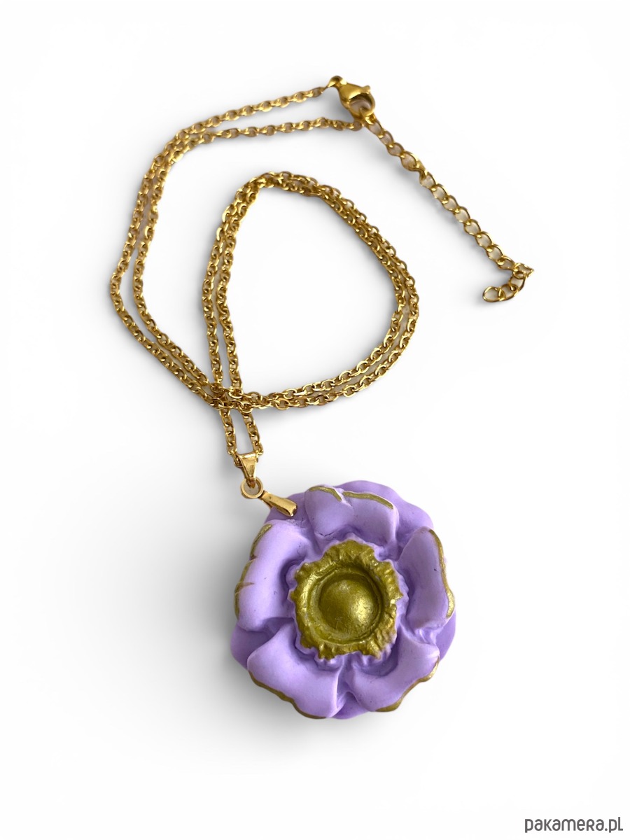 Delikatny, a jednocześnie wyrazisty wisiorek w kształcie kwiatu, wykonany ręcznie z gliny polimerowej i subtelnie podkreślony złotym środkiem. Osadzony na minimalistycznym łańcuszku ze stali nierdzewnej tworzy lekką, harmonijną całość o rzemieślniczym charakterze.