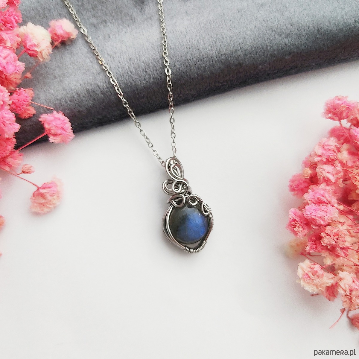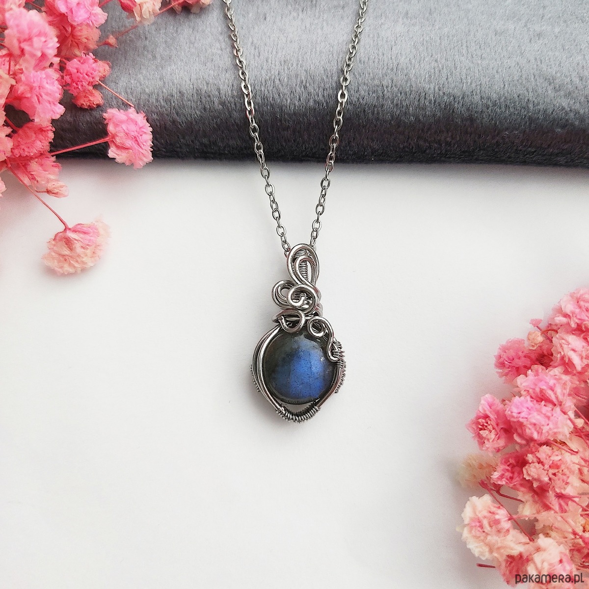 Naszyjnik Labradoryt Mini ręcznie robiony. Wykonany techniką wire wrapping z drutów ze stali chirurgicznej.