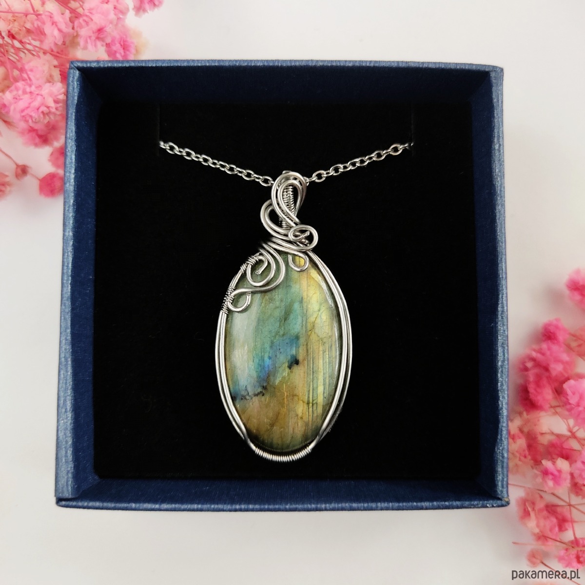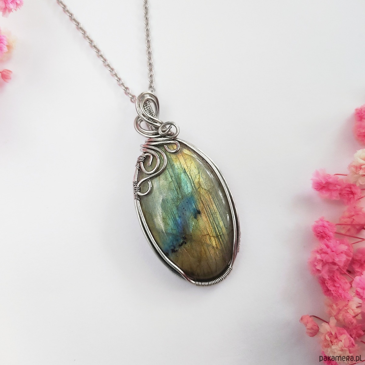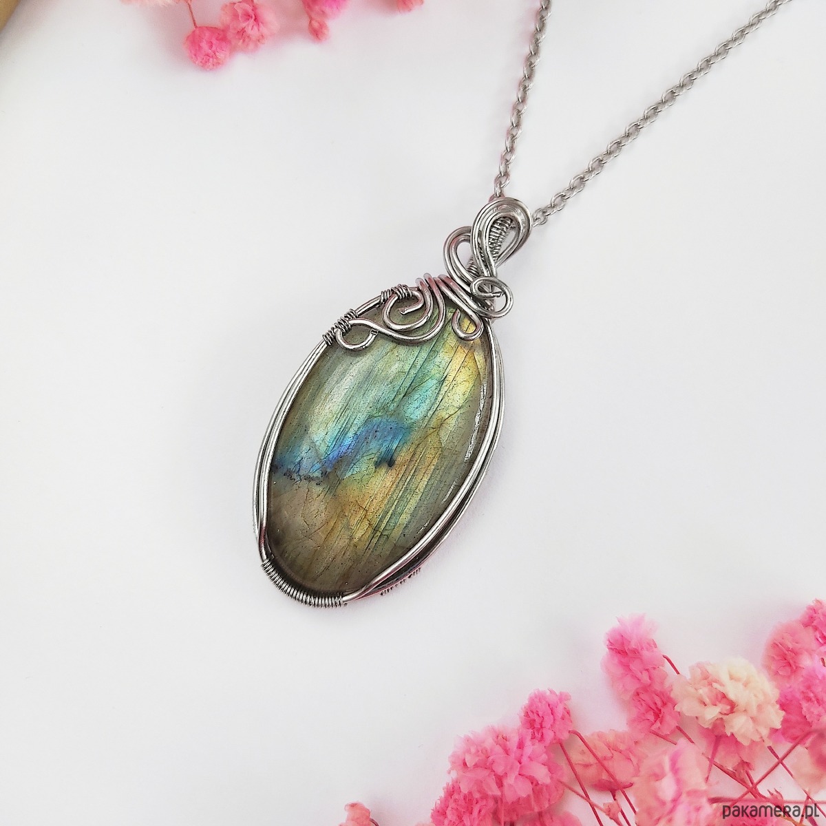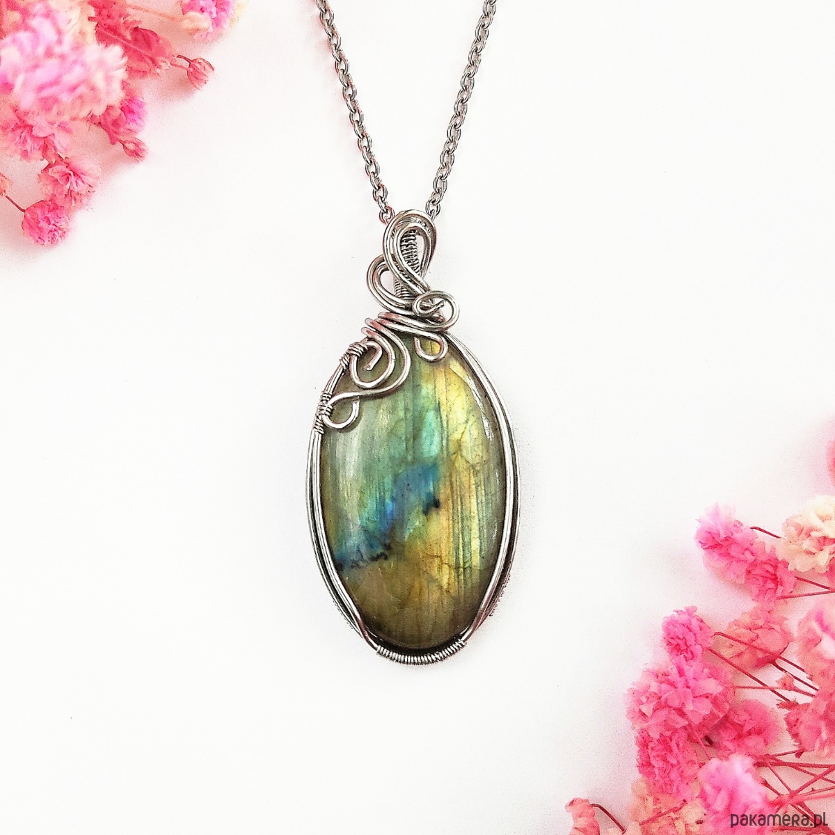 Naszyjnik Labradoryt Owal ręcznie wykonany z drutów ze stali chirurgicznej metodą wire wrapping.