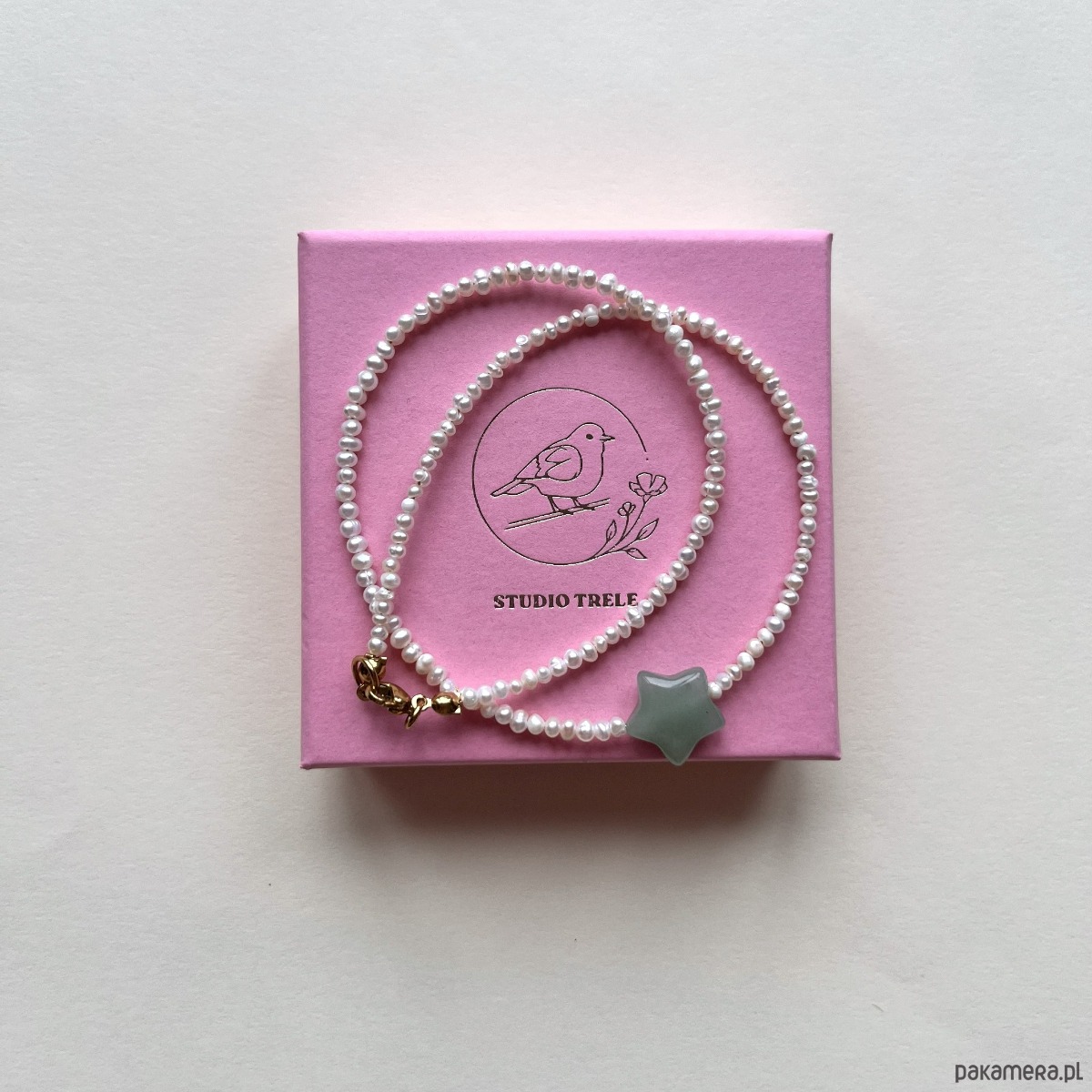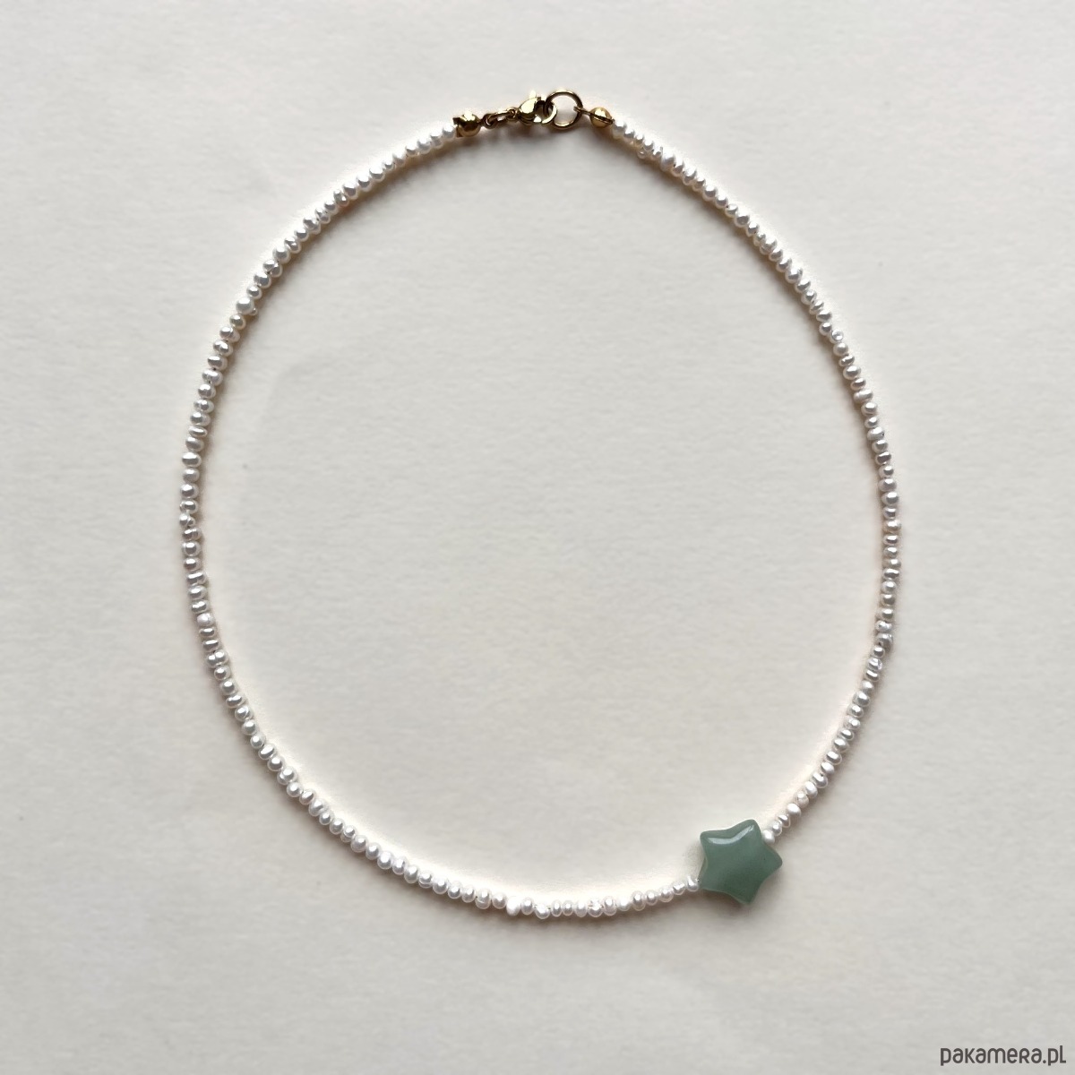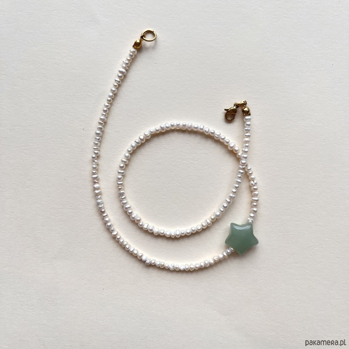 Drobne perły połączone z gwiazdką z awenturynu w odcieniu zieleni. Świeży, lekki i wakacyjny w odbiorze. Subtelny kolor kamienia dodaje mu miękkości i naturalnego uroku.