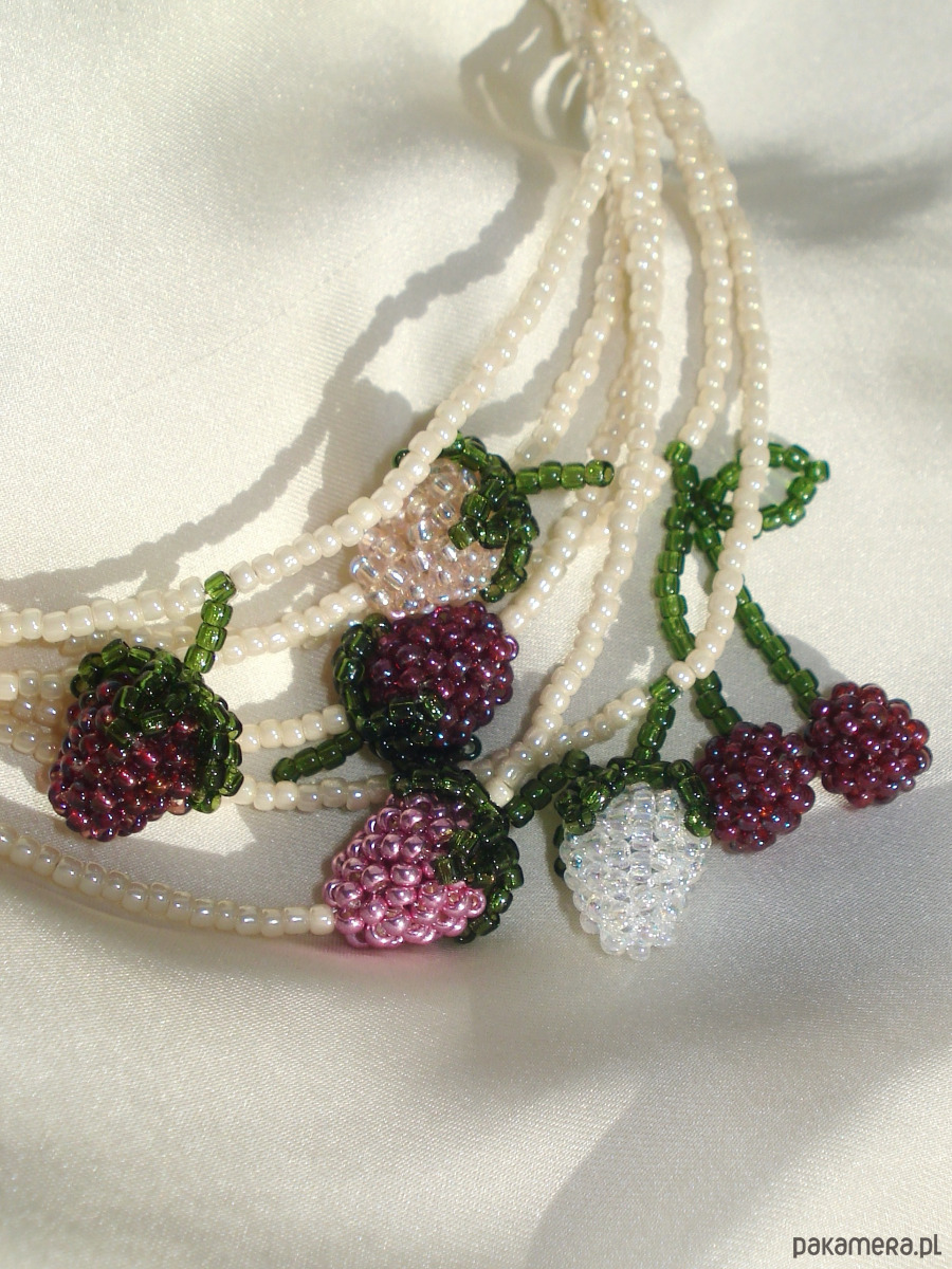Owoce są ręcznie szyte z najwyższej jakości japońskich, szklanych koralików.