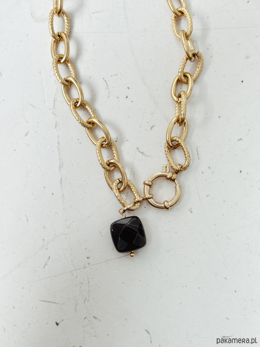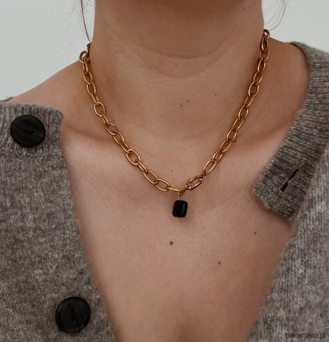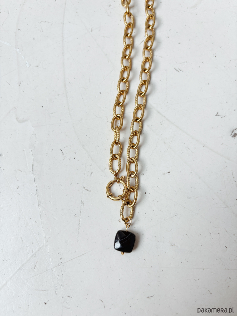 Naszyjnik wykonany jest łańcuszka,zapięcia wykonanych ze stali ch, kamień zawieszka to agat czarny.