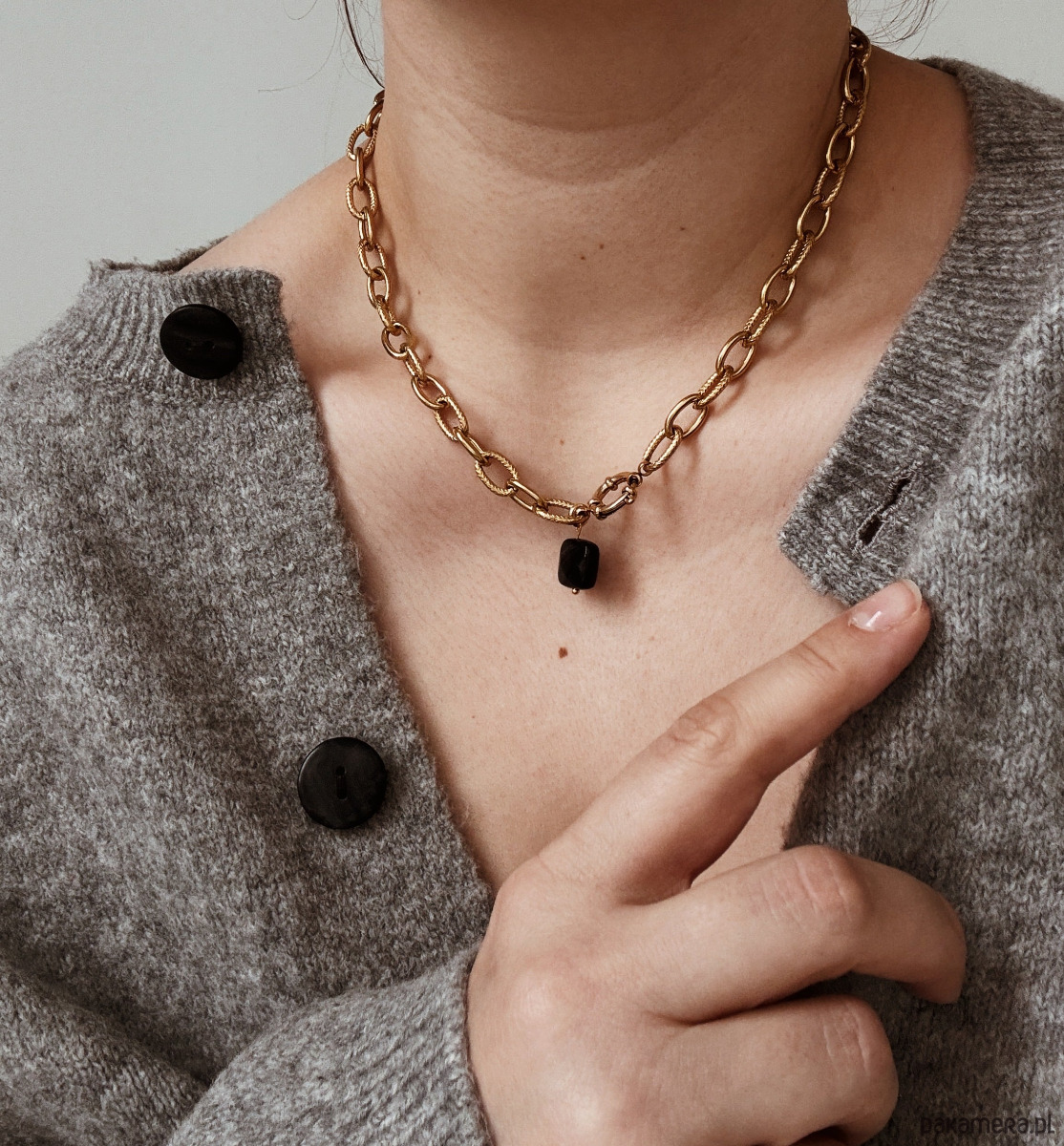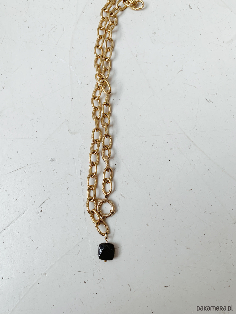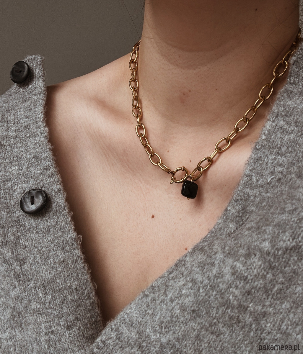 Naszyjnik wykonany jest łańcuszka,zapięcia wykonanych ze stali ch, kamień zawieszka to agat czarny.