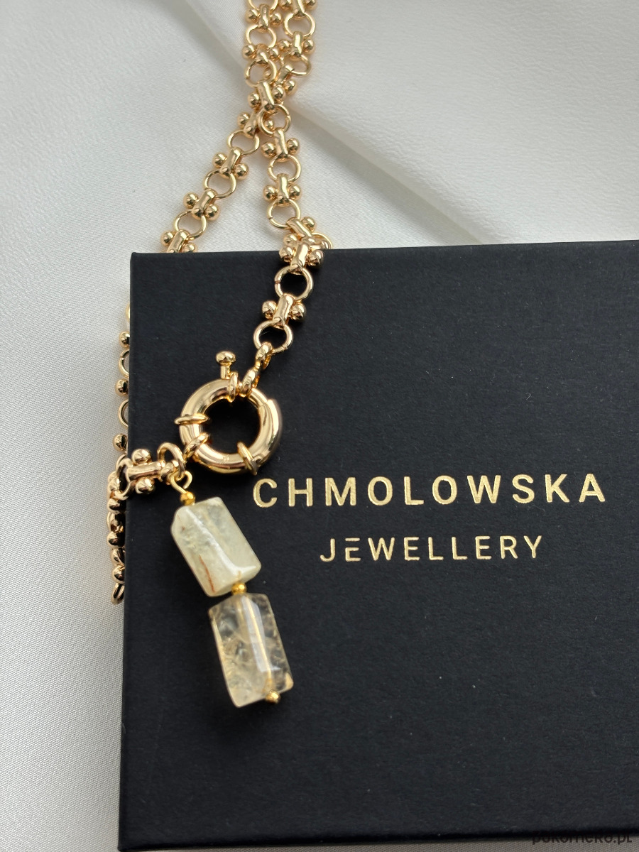 Naszyjnik wykonany jest łańcuszka, zapięcia rodowanych złotem i zawieszki z cytrynu.