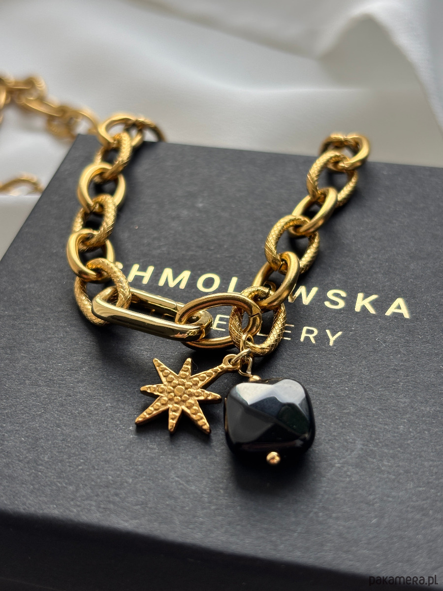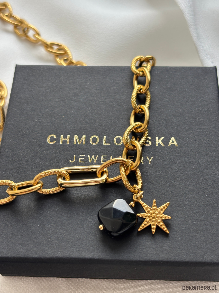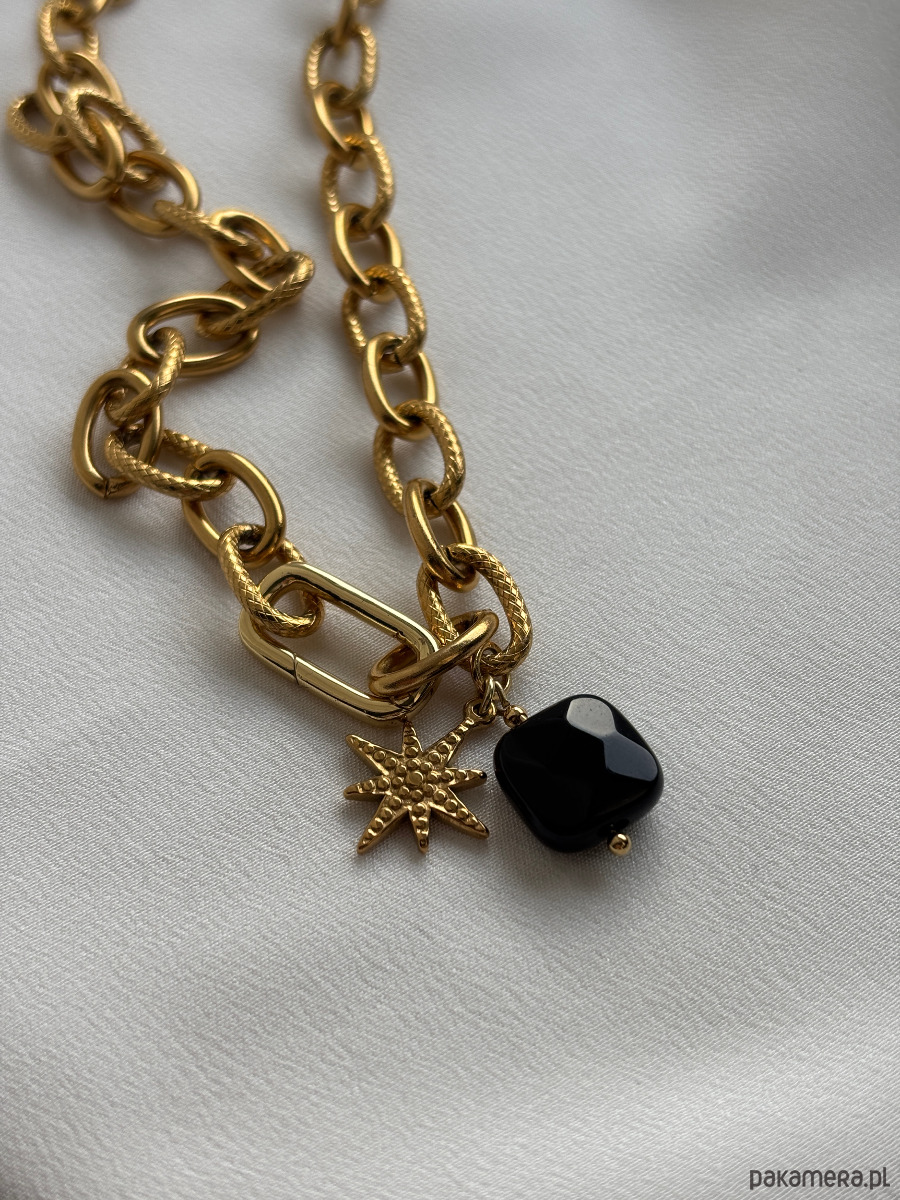 Naszyjnik wykonany jest łańcuszka, zapięcia i zawieszki ze stali ch. a także zawieszki z agatu czarnego.