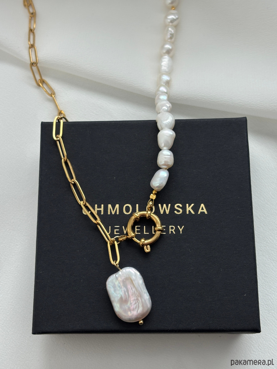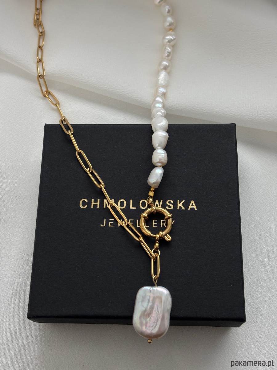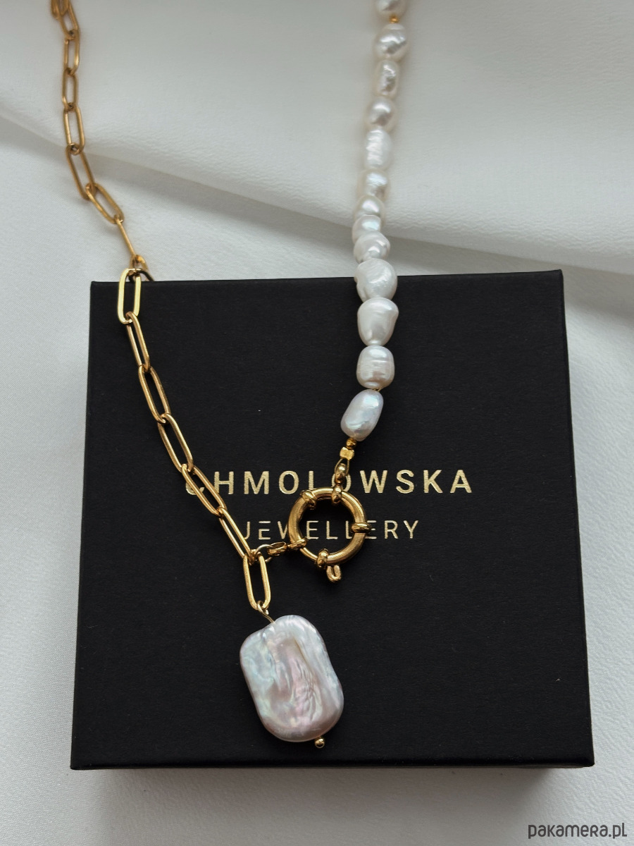 Naszyjnik wykonany jest na lince jubilerskiej z użyciem pereł naturalnych,zawieszki z perły łańcuszka i zapięcia ze stali ch.