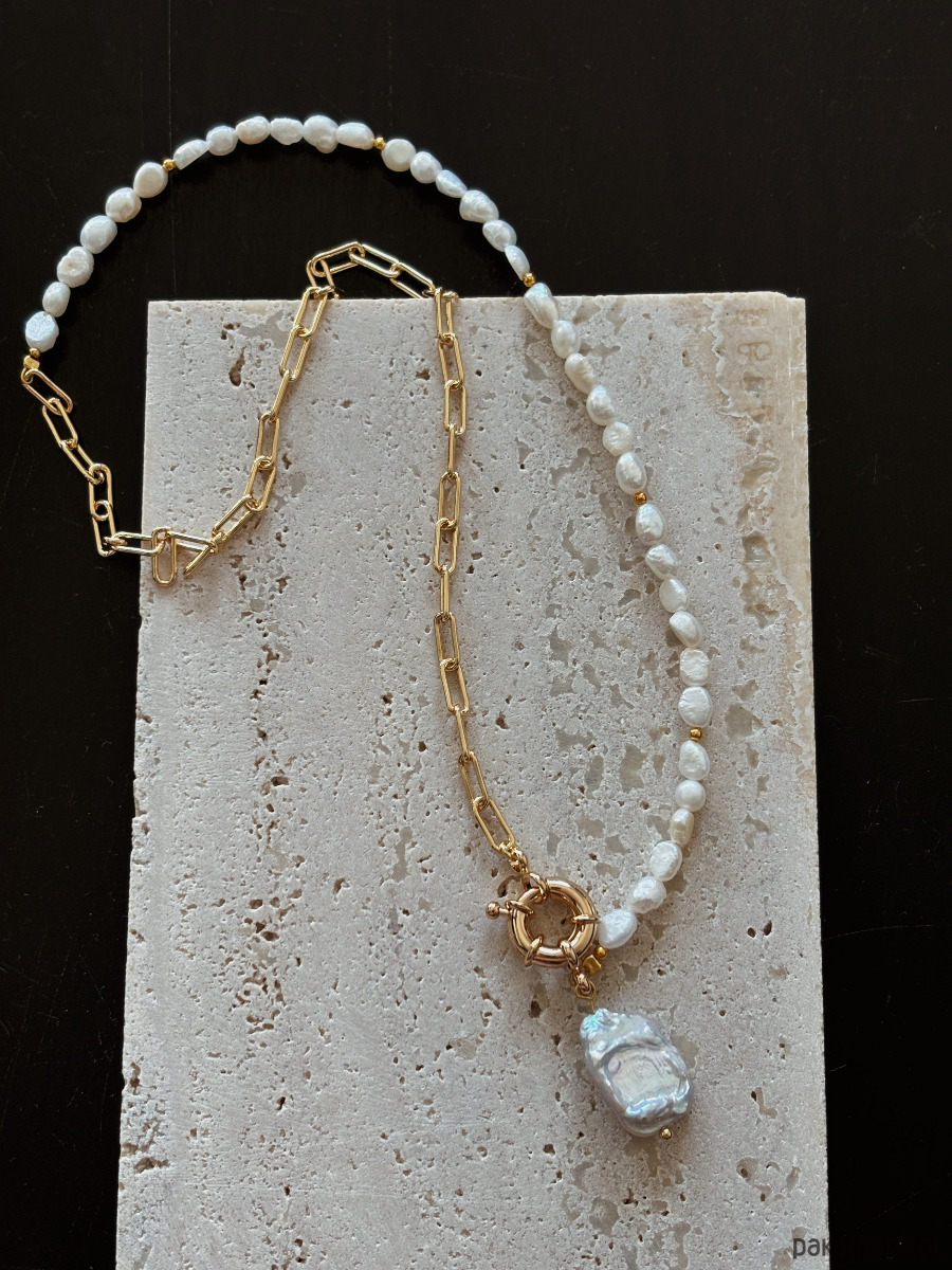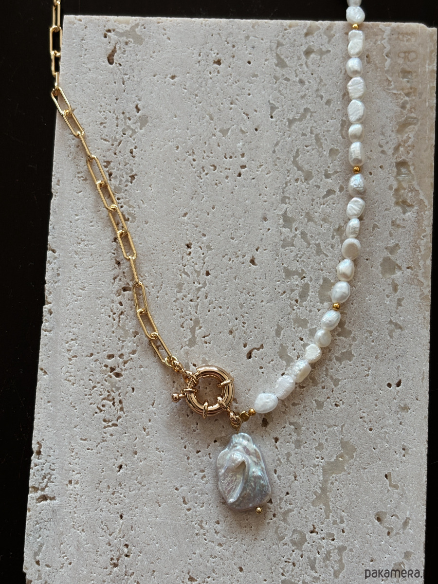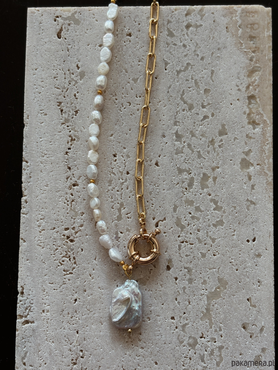 Naszyjnik wykonany jest na lince jubilerskiej z pereł naturalnych , zapięcia ozdobnego i łańcuszka rodowanych złotem.
