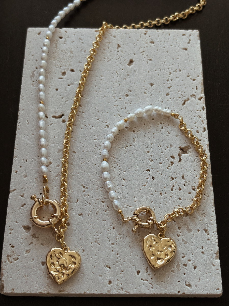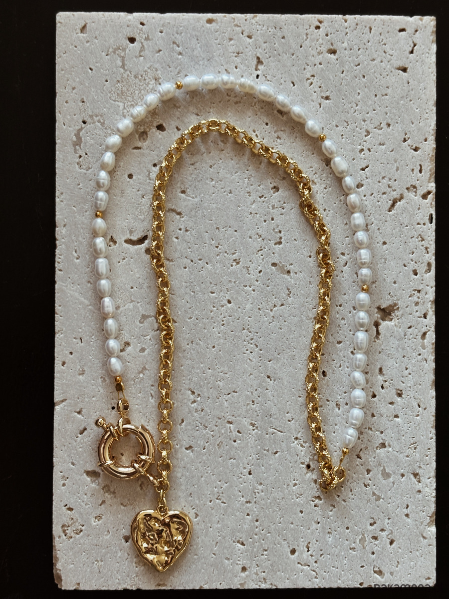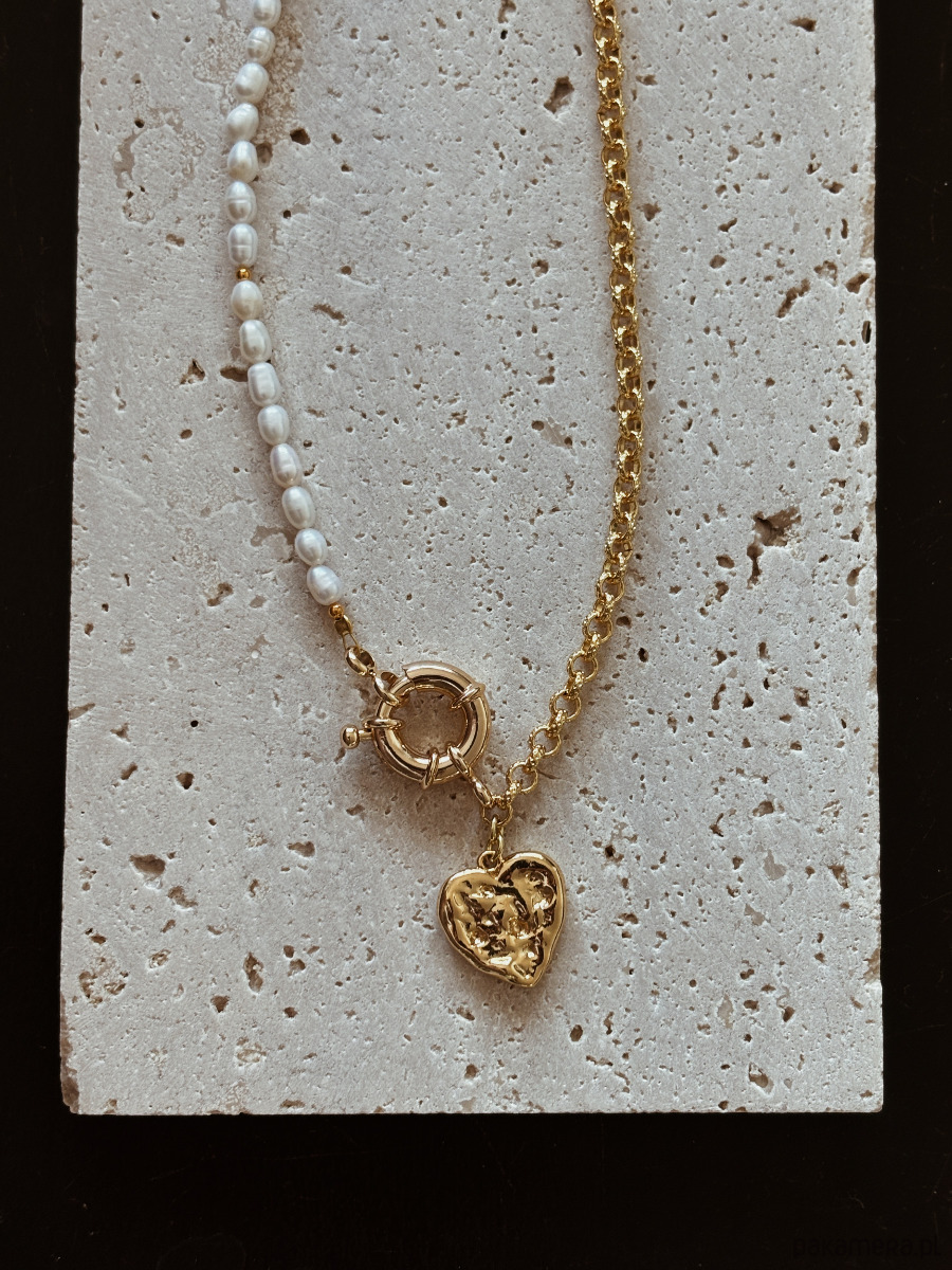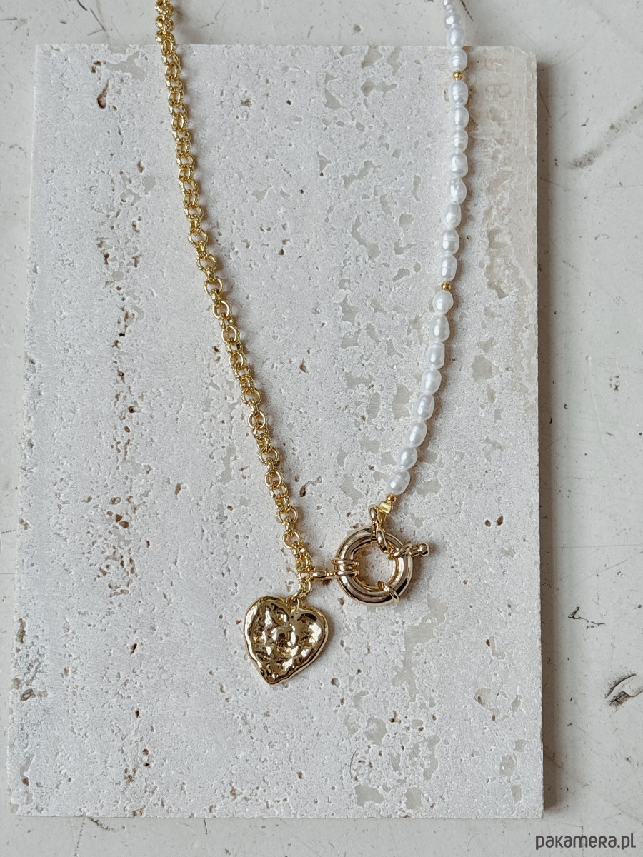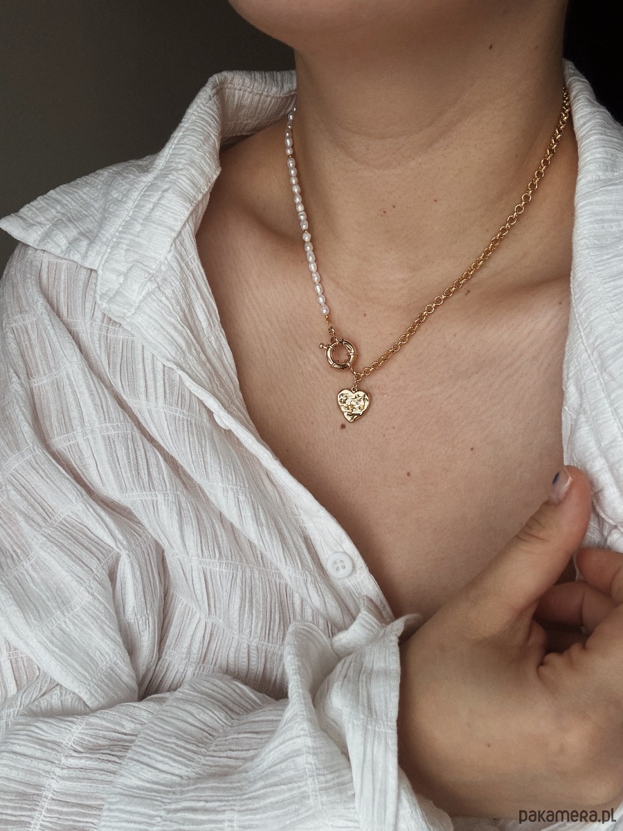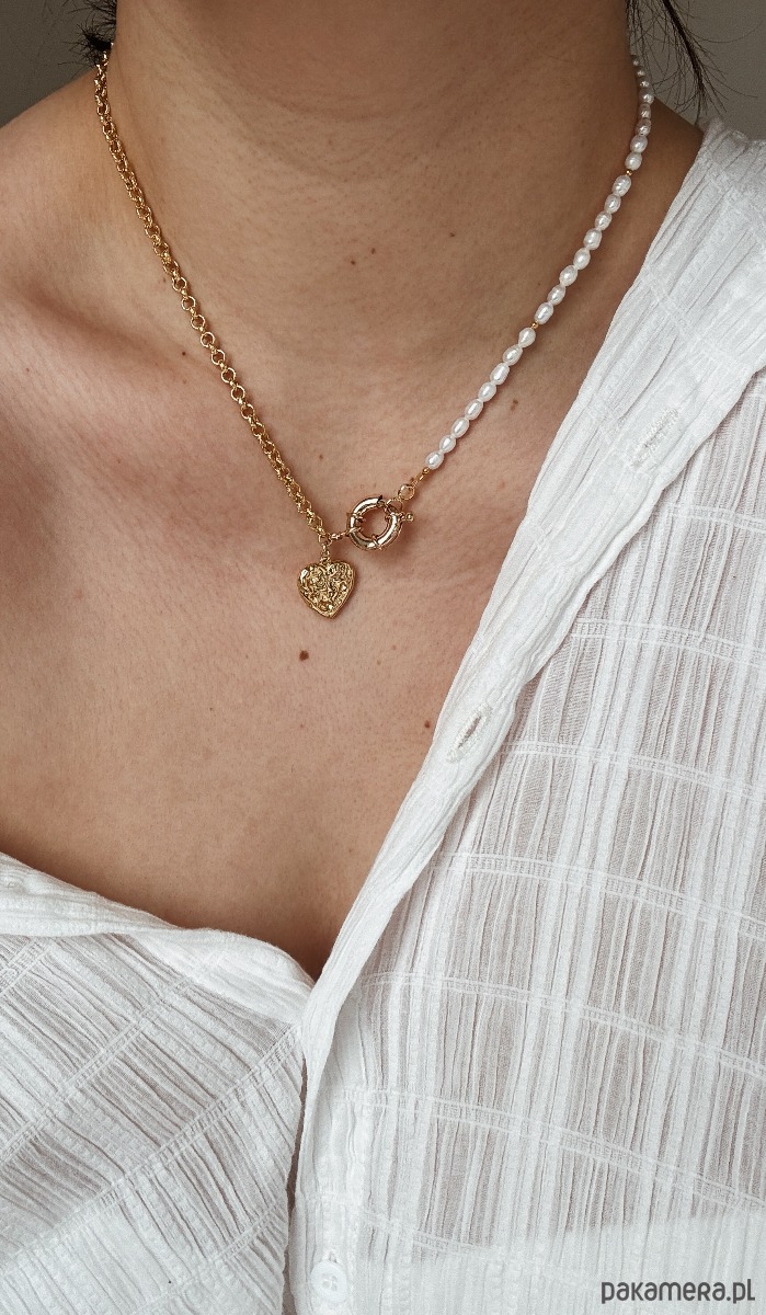 Naszyjnik wykonany jest na lince jubilerskiej z użyciem pereł naturalnych,łańcuszka ze stali ch, zawieszki serca rodowanego złotem i ozdobnego zapięcia.