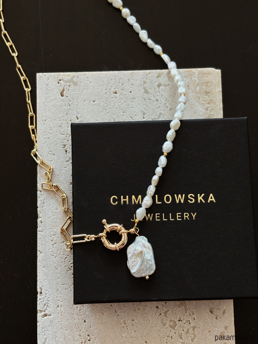 Naszyjnik wykonany jest na lince jubilerskiej z pereł naturalnych , zapięcia ozdobnego i łańcuszka rodowanych złotem.