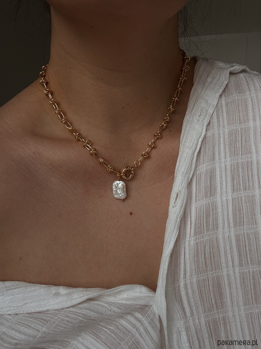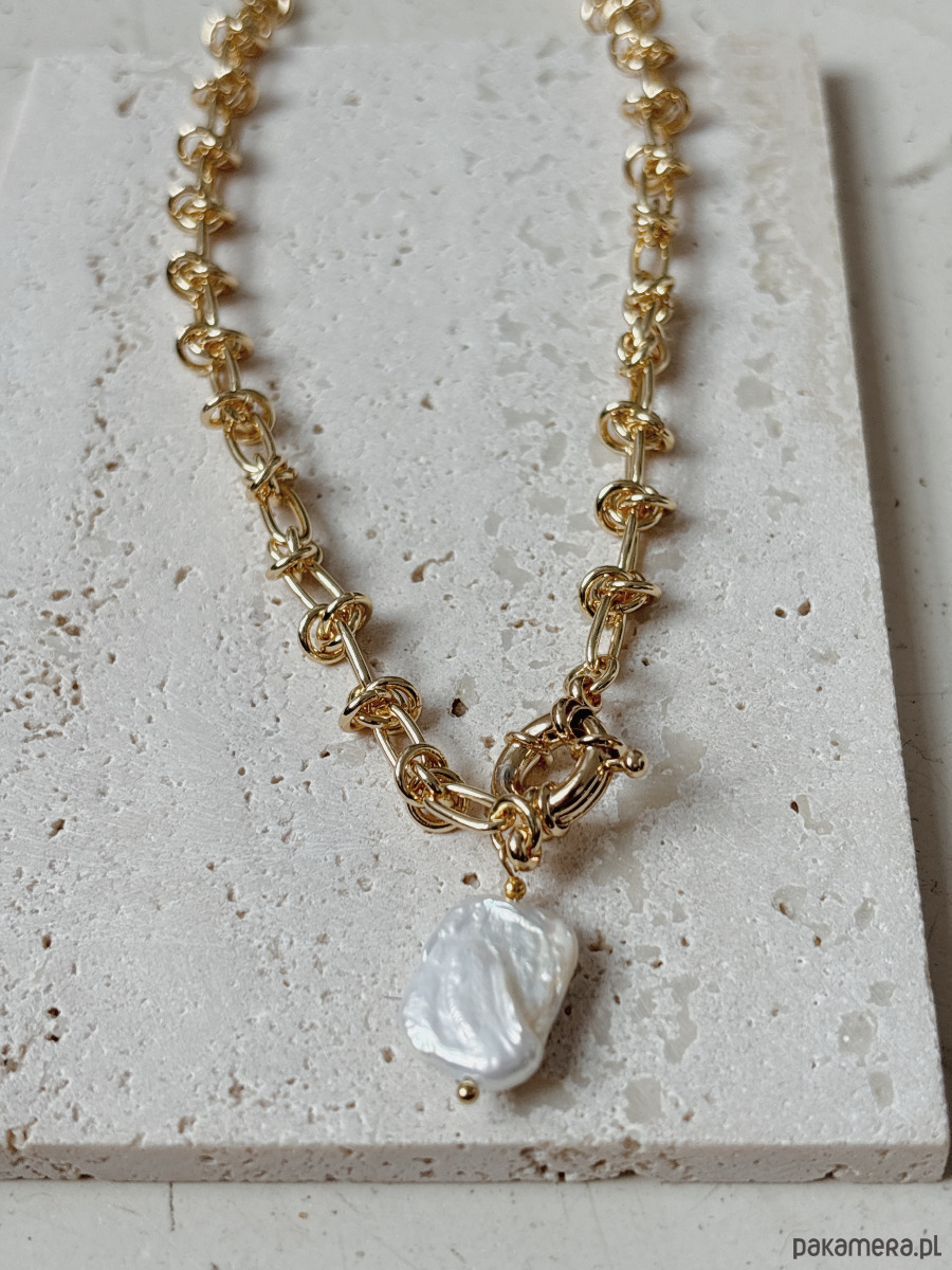 Naszyjnik wykonany jest łańcuszka,zapięcia rodowanego 14K złotem i zawieszki w formie perły naturalnej.