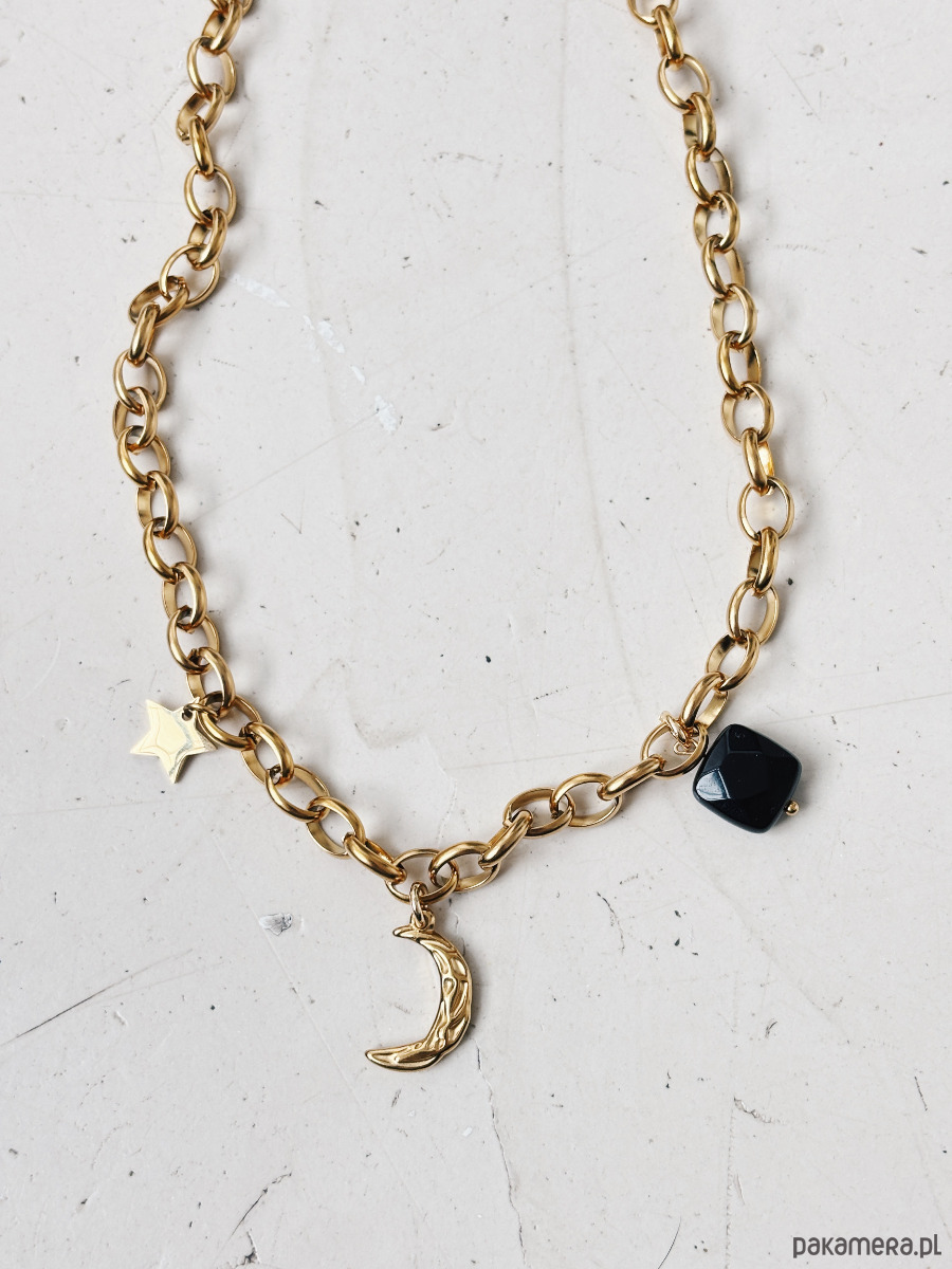 Naszyjnik wykonany jest łańcuszka,zapięcia i zawieszek wykonanych ze stali ch, kamień zawieszka to agat czarny.