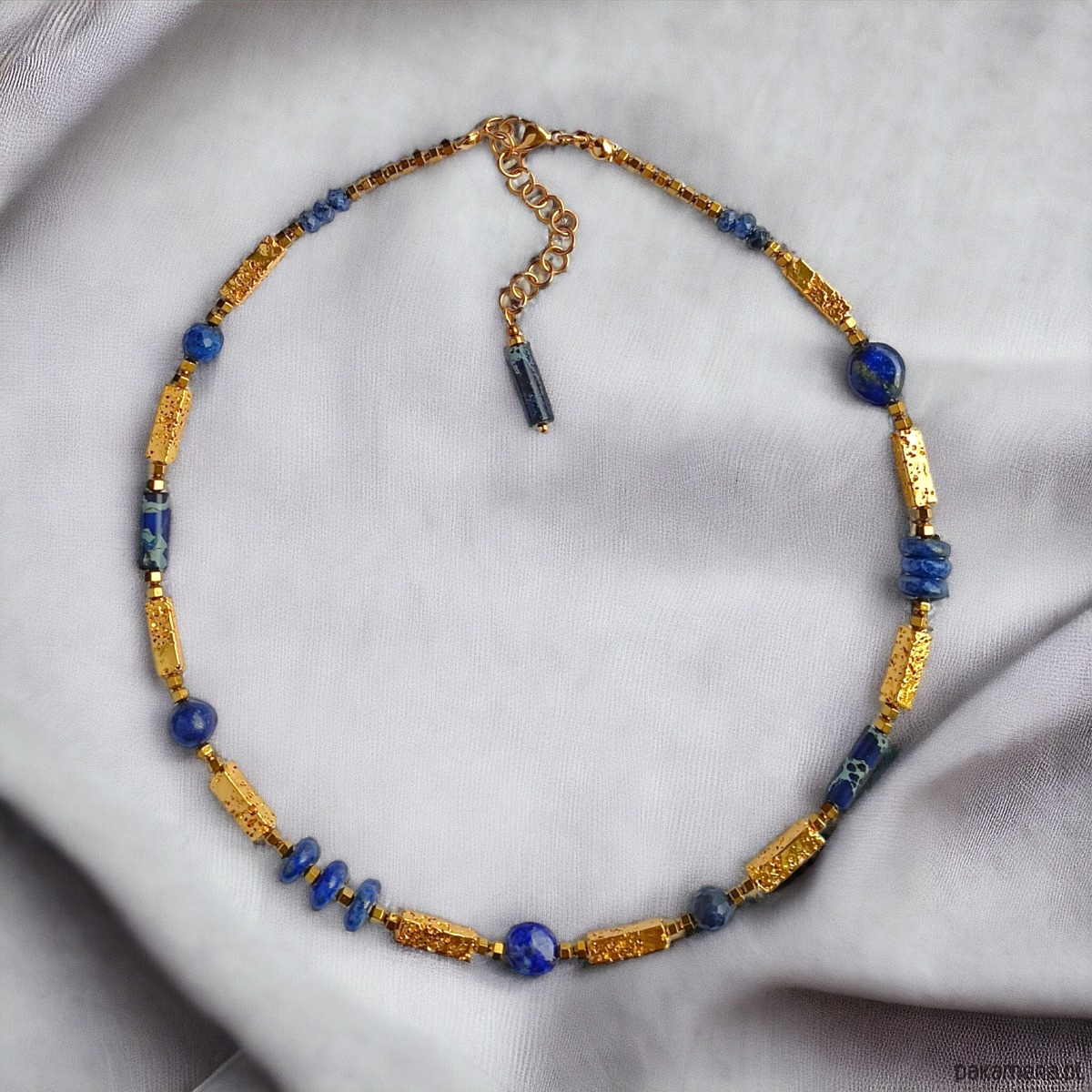 Zjawiskowy naszyjnik - choker na solidnej lince stalowej (miękkiej) - został wykonan z kul, pastylek i plasterków lapis lazuli, jaspisu cesarskiego i fasetowanego jadeitu oraz złotej lawy wulkanicznej i złotego hematytu (3mm) o ciekawym szlifie.