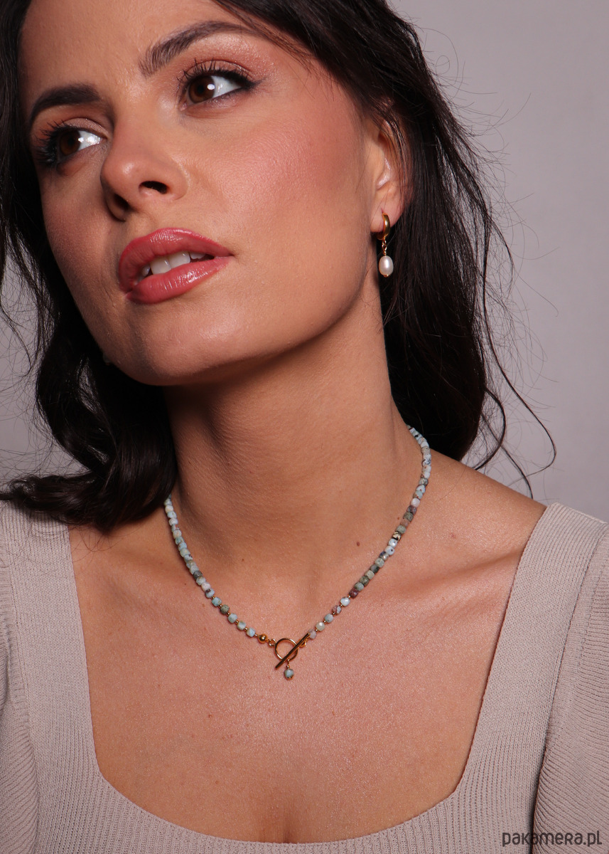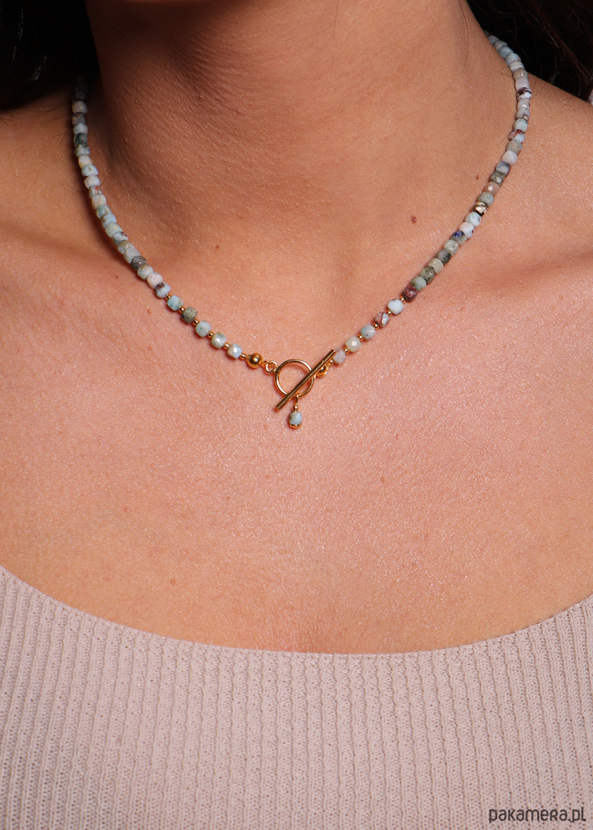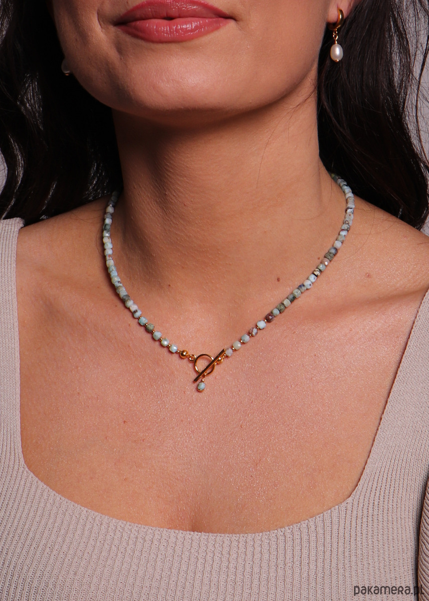 Cechy produktuKamień: larimarWielkość kamieni: ok. 4 mm Kolor: niebieski, miętowy, biały, zielonyWykończenie: srebro pr. 925, pozłacane 24k złotemMożliwość wyboru zawieszki Właściwość kamieniaLarimar jest kamieniem, który dodaje odwagi, przyciąga wewnętrzny spokój i harmonię. Wzmacnia kreatywność. Pomaga radzić sobie w stresujących sytuacjach oraz wspiera konstruktywne myślenie i rozwiązywanie problemów. Pozwala opanować emocje.Idealny na prezentNaszyjnik będzie idealnym pomysłem na prezent. Biżuteria, ręcznie wykonywana z kamieni naturalnych wpisuje się w obecne trendy, dzięki czemu możesz mieć pewność, że zachwyci obdarowaną osobę. Nasz naszyjnik z kamieniami naturalnymi jest uniwersalnym, eleganckim elementem ubioru, który obłędnie wyglądać będzie w zestawieniu z każdą stylizacją. OpakowanieNaszyjnik zapakowany będzie w minimalistyczne, granatowe pudełeczko ze złotym logo. Wewnątrz pudełeczka znajdziesz białą wkładkę z nazwą kamienia oraz jego wyjątkowymi właściwościami. Dbaj o biżuterię. Unikaj kontaktu z wodą, detergentami i kosmetykami.