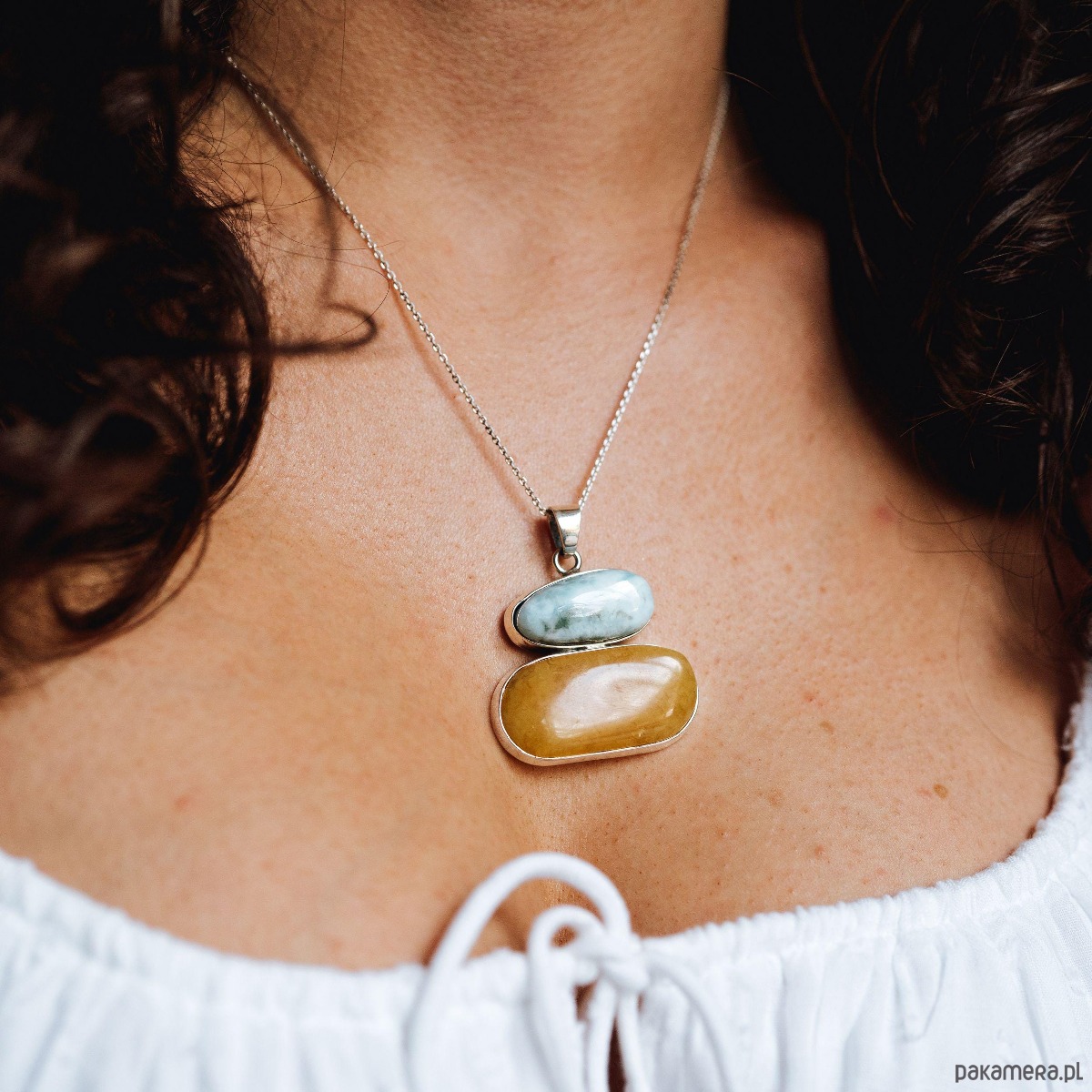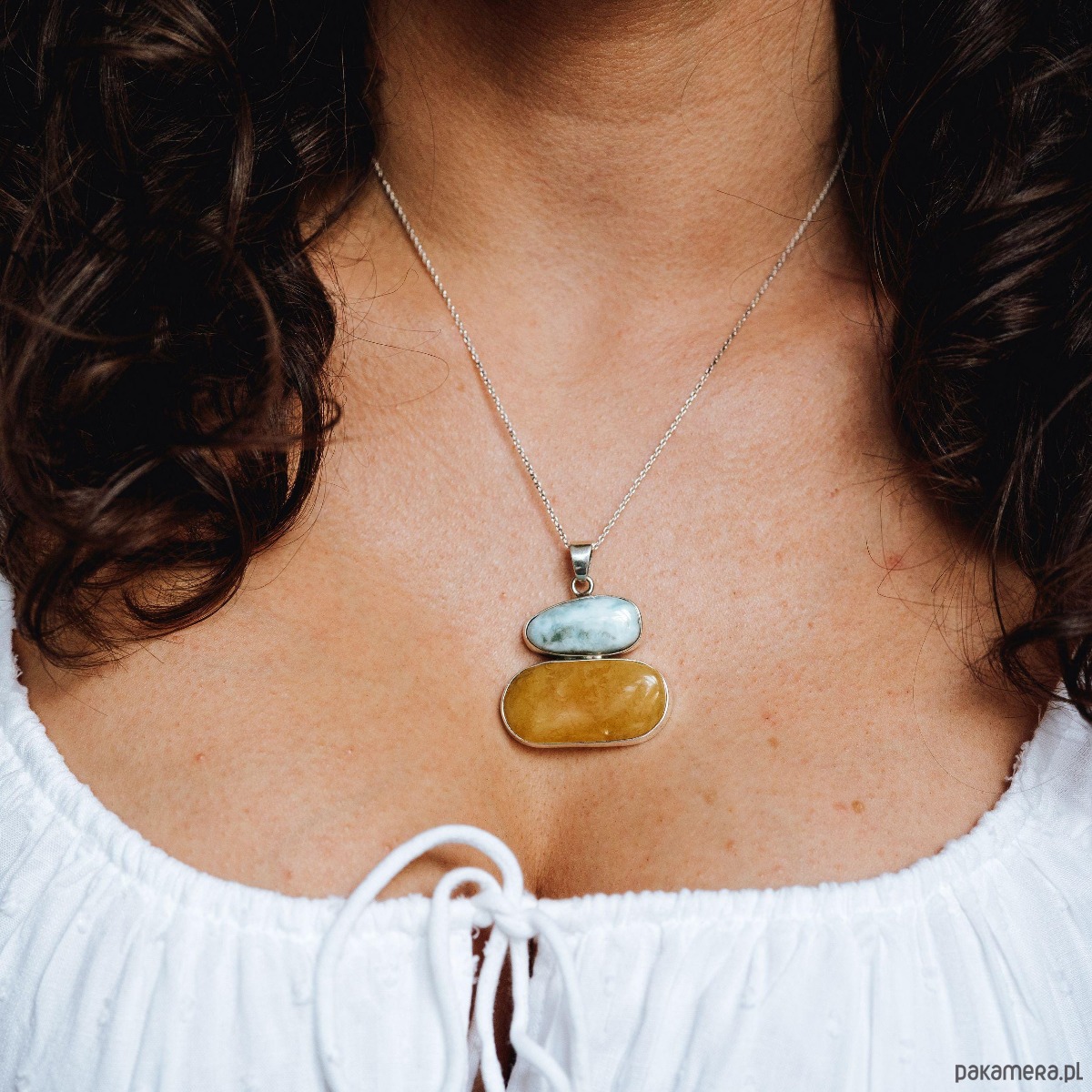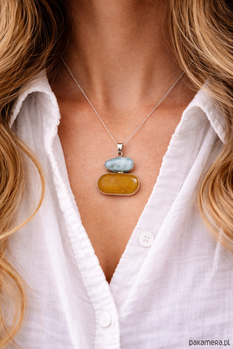 Larimar, znany ze swoich kojących, morskich odcieni, w połączeniu z ciepłym, bursztynowym kolorem tworzy harmonijny, ponadczasowy wzór. Zawieszka osadzona w starannie wykończonym srebrze podkreśla naturalne piękno kamieni i nadaje całości eleganckiego charakteru. Naszyjnik doskonale sprawdzi się jako dodatek do codziennych stylizacji oraz jako wyjątkowy prezent na rocznicę, urodziny czy inne szczególne okazje.