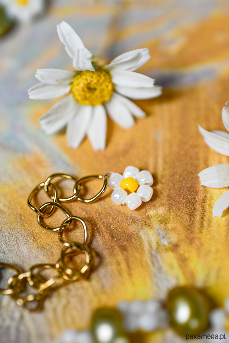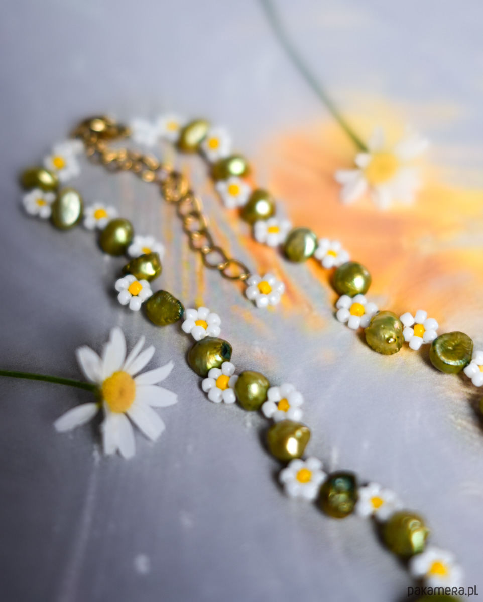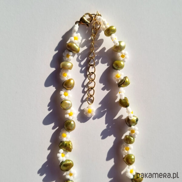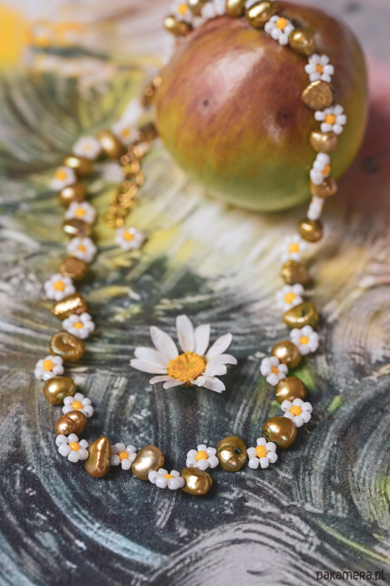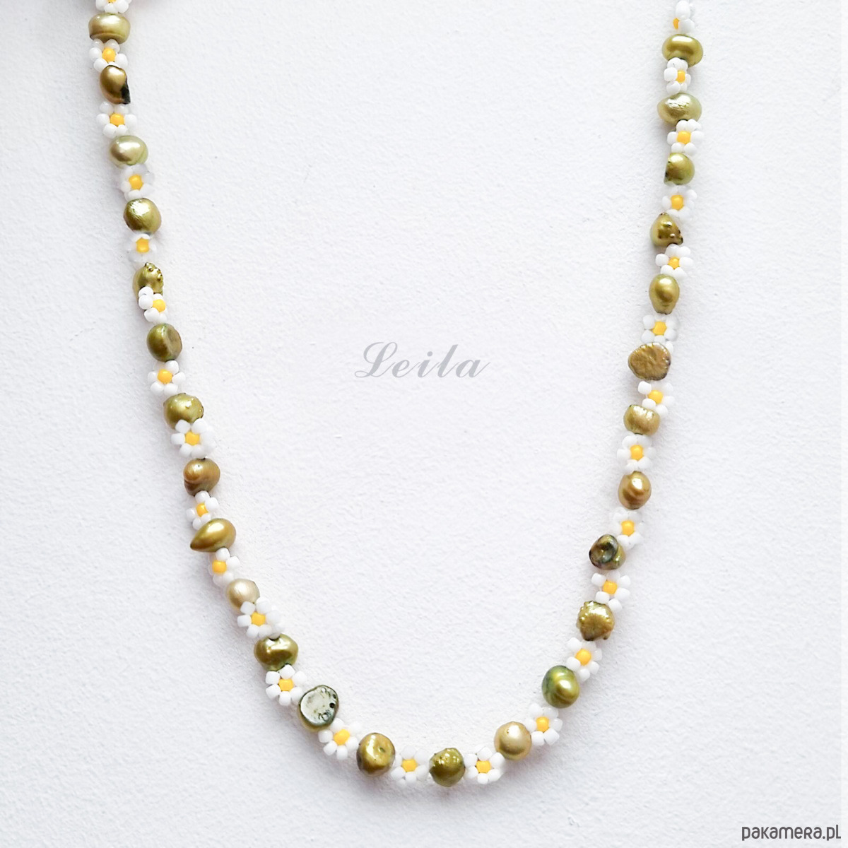 Naszyjnik handmade Leila, biżuteria z perełami i szklanymi stokrotkami