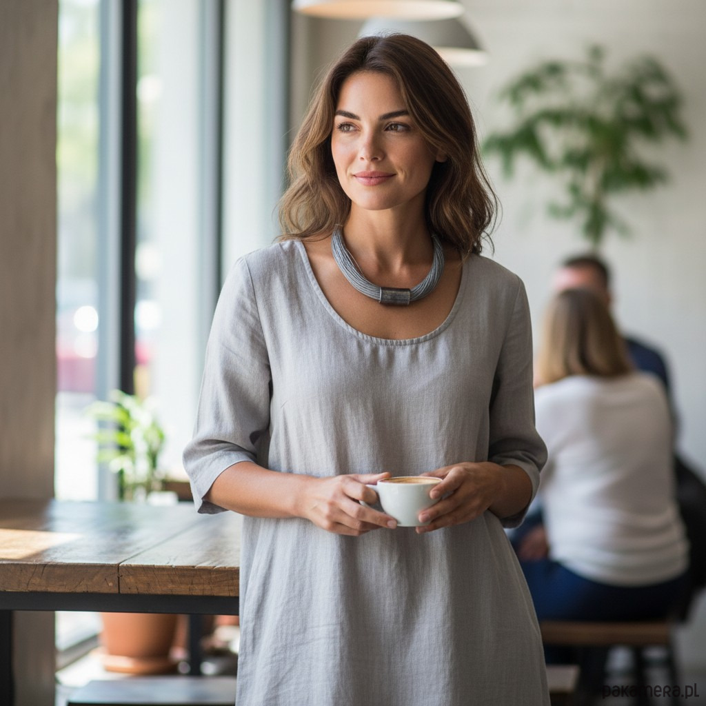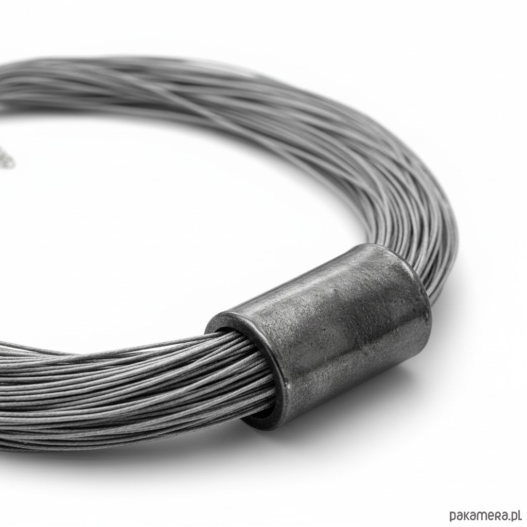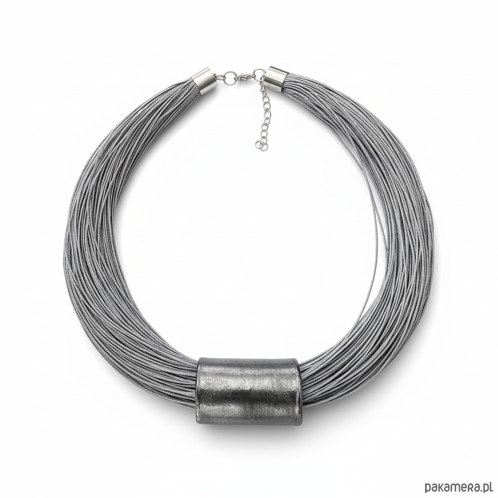 Naszyjnik wykonany z wyprodukowanego w Polsce, wysokogatunkowego lnu w kolorze szarym oraz ręcznie wykonanego elementu ceramiki szkliwionej w kształcie spłaszczonego walca o wymiarach: długość ok. 4cm, średnica ok. 2,5cm.. Został on wykończony elementami metalowymi w kolorze stalowym, a zapinany jest na karabińczyk.