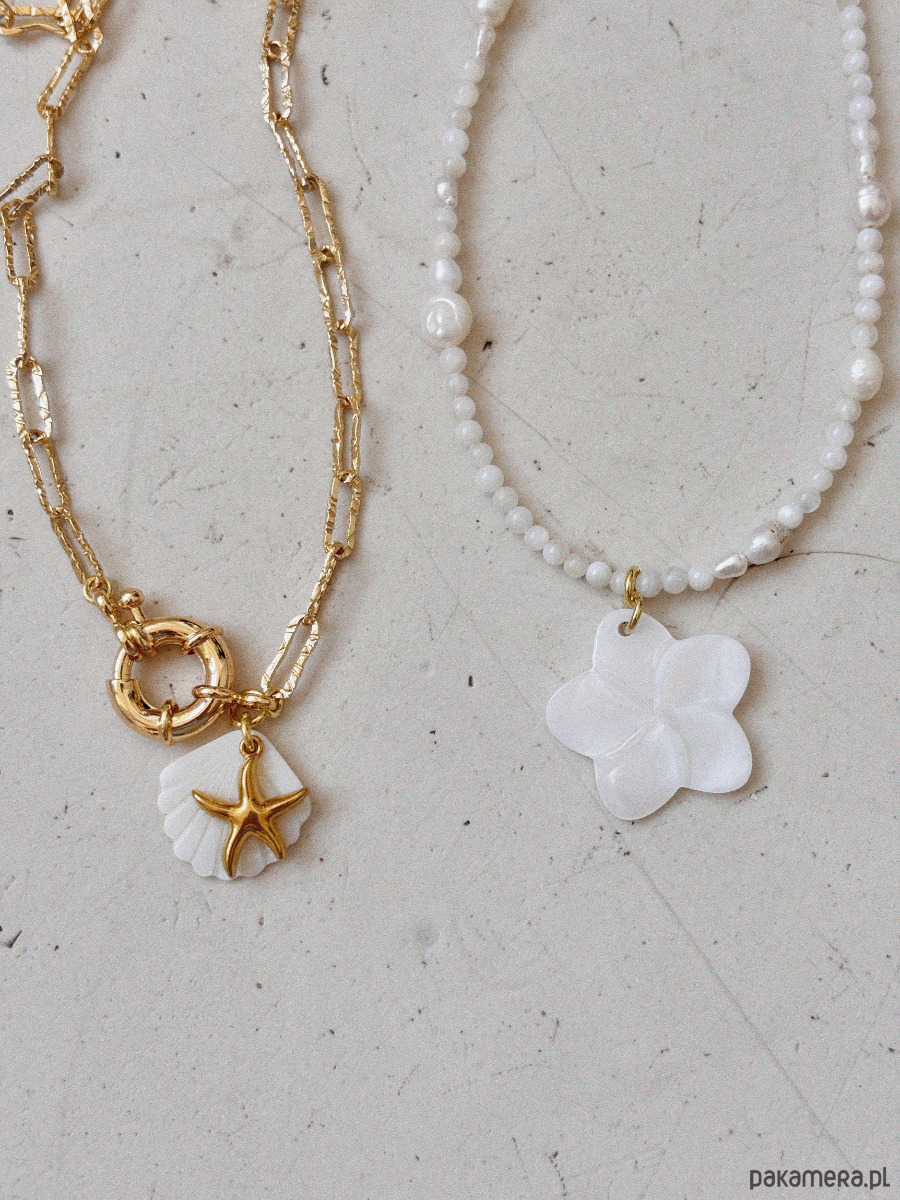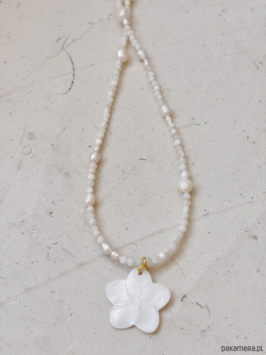 Naszyjnik wykonany jest na lince jubilerskiej z użyciem kamienia księżycowego i pereł naturalnych, a także zawieszki z masy perłowej. Zapięcie i łańcuszek są rodowane złotem.