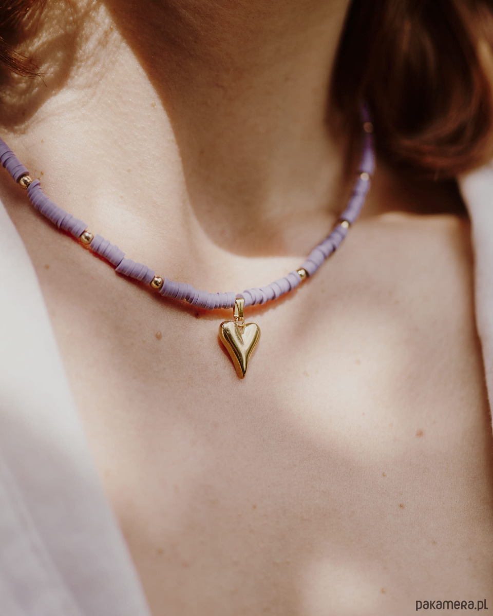 Wykonany jest z koralików katsuki w kolorze lila, przełożonych kulkami hematytu. Wykończony jest eleganckim sercem zwieszonym na krawatce.