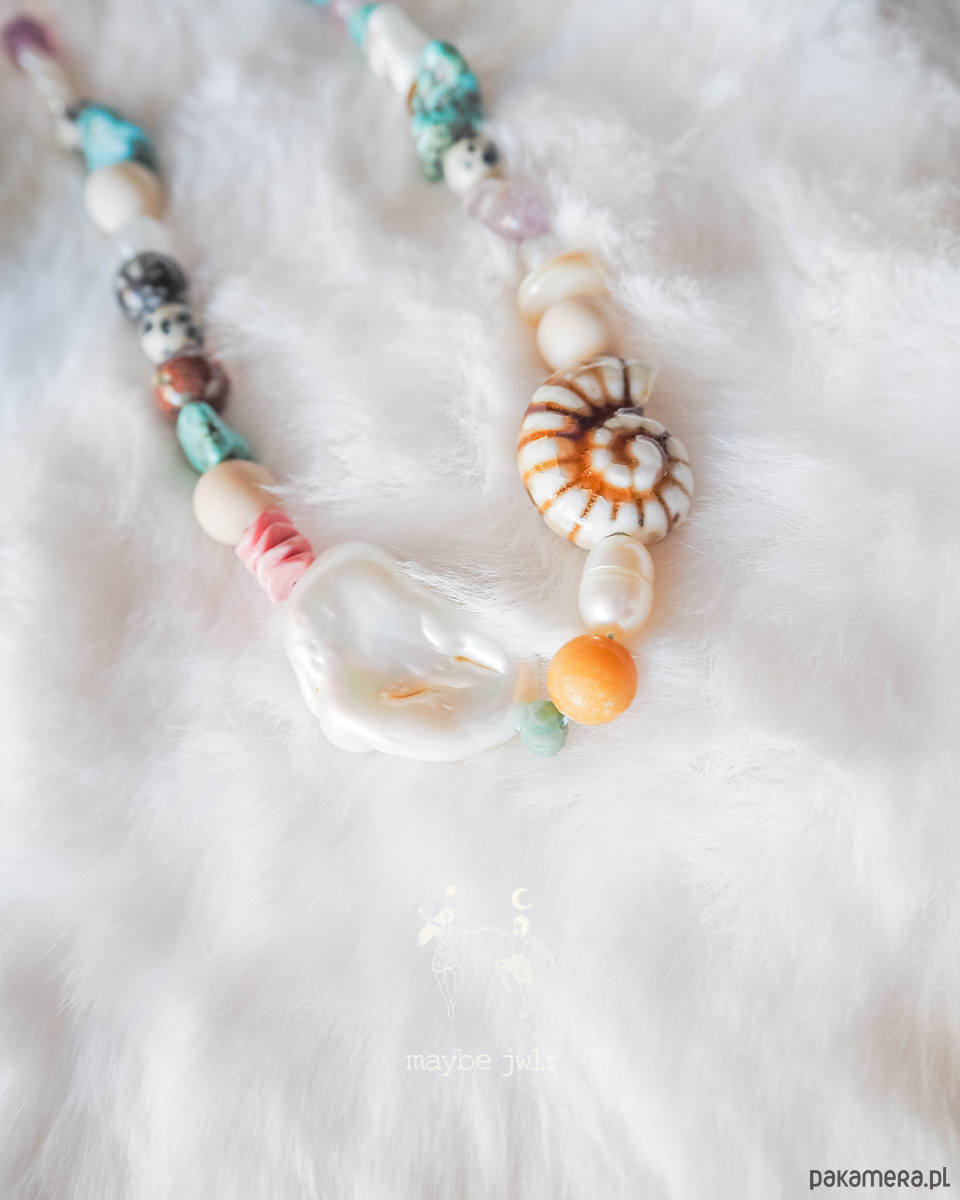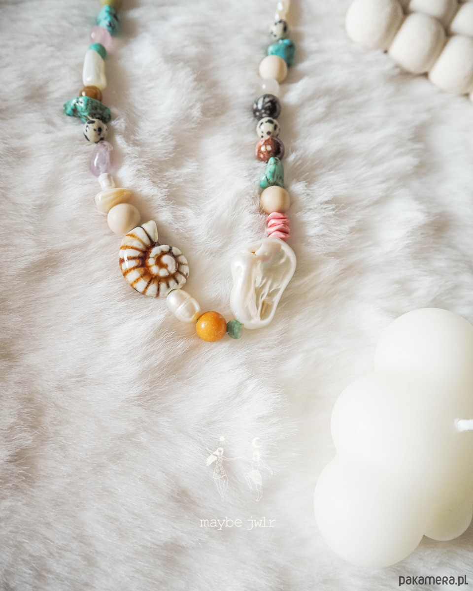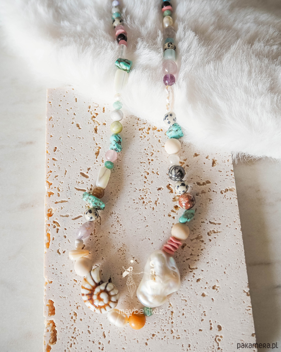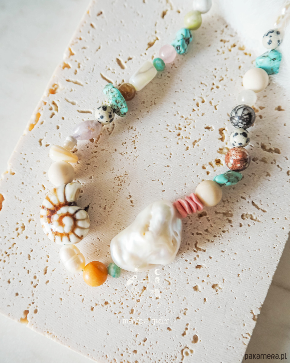 Linia Brzegu jest wyrazista, pełna morskich akcentów, w centrum znajduje się duża, nieregularna perła barokowa, muszla ślimaka z ceramiki, turkusowe kamienie howlit. Inne kamienie użyte w naszyjniku to perły słodkowodne, kamienie rzeczne, jaspisy dalmatyńskie, muszle, agaty, kwarce, amazonity.