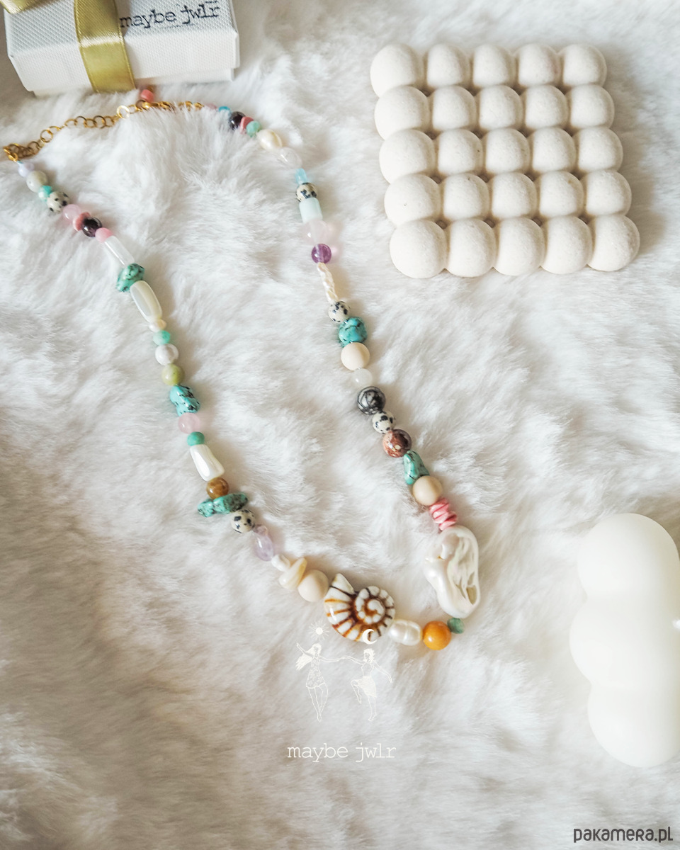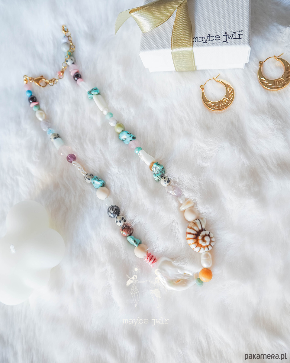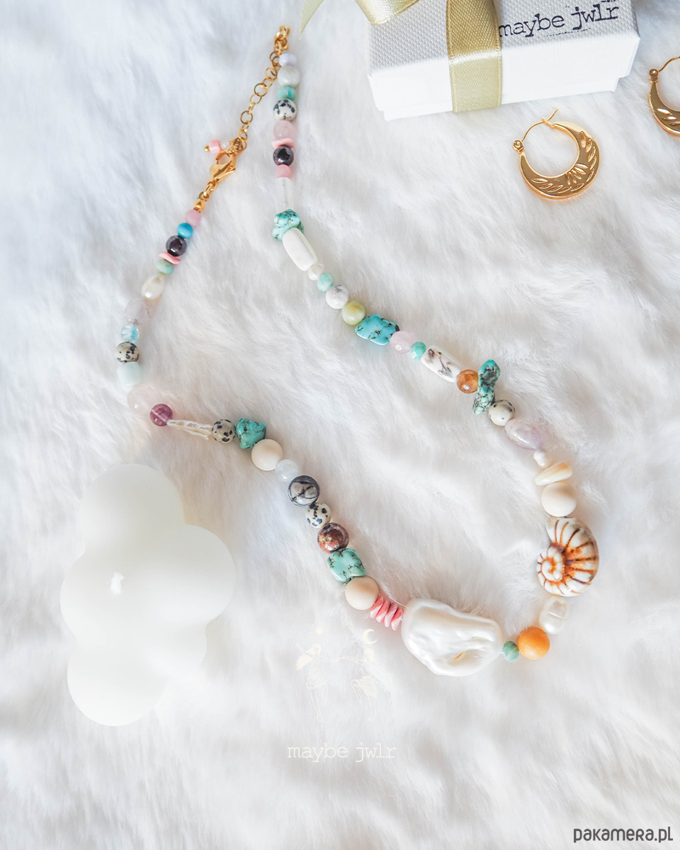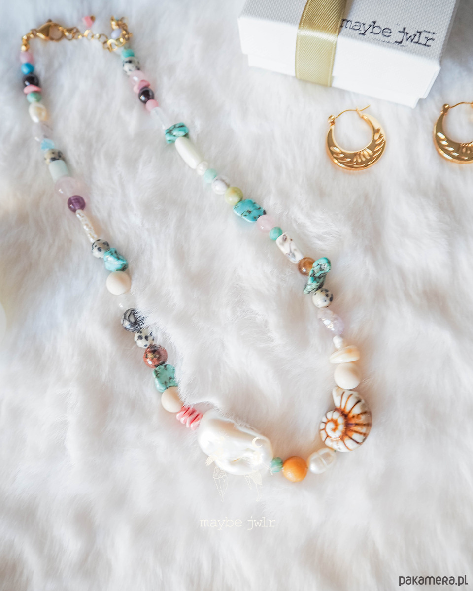 Linia Brzegu jest wyrazista, pełna morskich akcentów, w centrum znajduje się duża, nieregularna perła barokowa, muszla ślimaka z ceramiki, turkusowe kamienie howlit. Inne kamienie użyte w naszyjniku to perły słodkowodne, kamienie rzeczne, jaspisy dalmatyńskie, muszle, agaty, kwarce, amazonity.