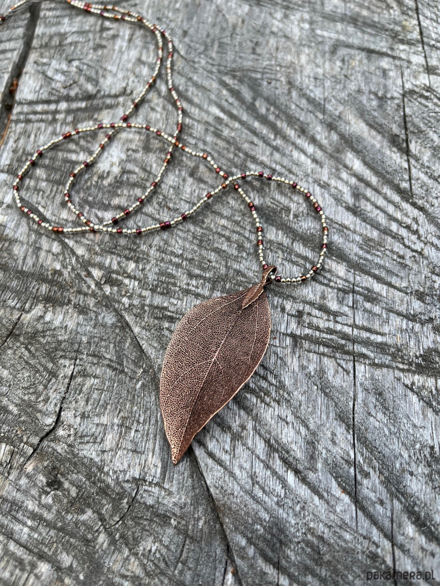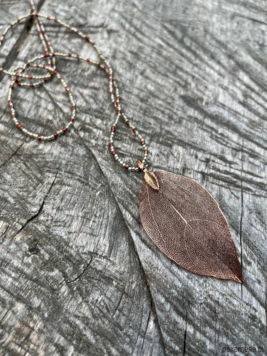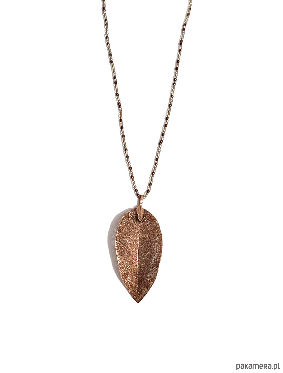 Efektowny naszyjnik, którego dominującym elementem jest ażurowy liść z metalu w kolorze miedzi. Liść wykonany jest z naturalnego liścia, dlatego zachowuje jego unikatowy, niepowtarzalny charakter. Liść zawieszony jest na sznurze z niewielkich szklanych koralików lśniących w promieniach światła. Ozdoba jest niezwykle lekka i delikatna, ale zdecydowanie przyciąga uwagę. Długość liścia ( bez zawieszki ) około 6 cm, długość sznura koralików 65 cm. Ozdoba do zakładania przez głowę, bez zapięcia.