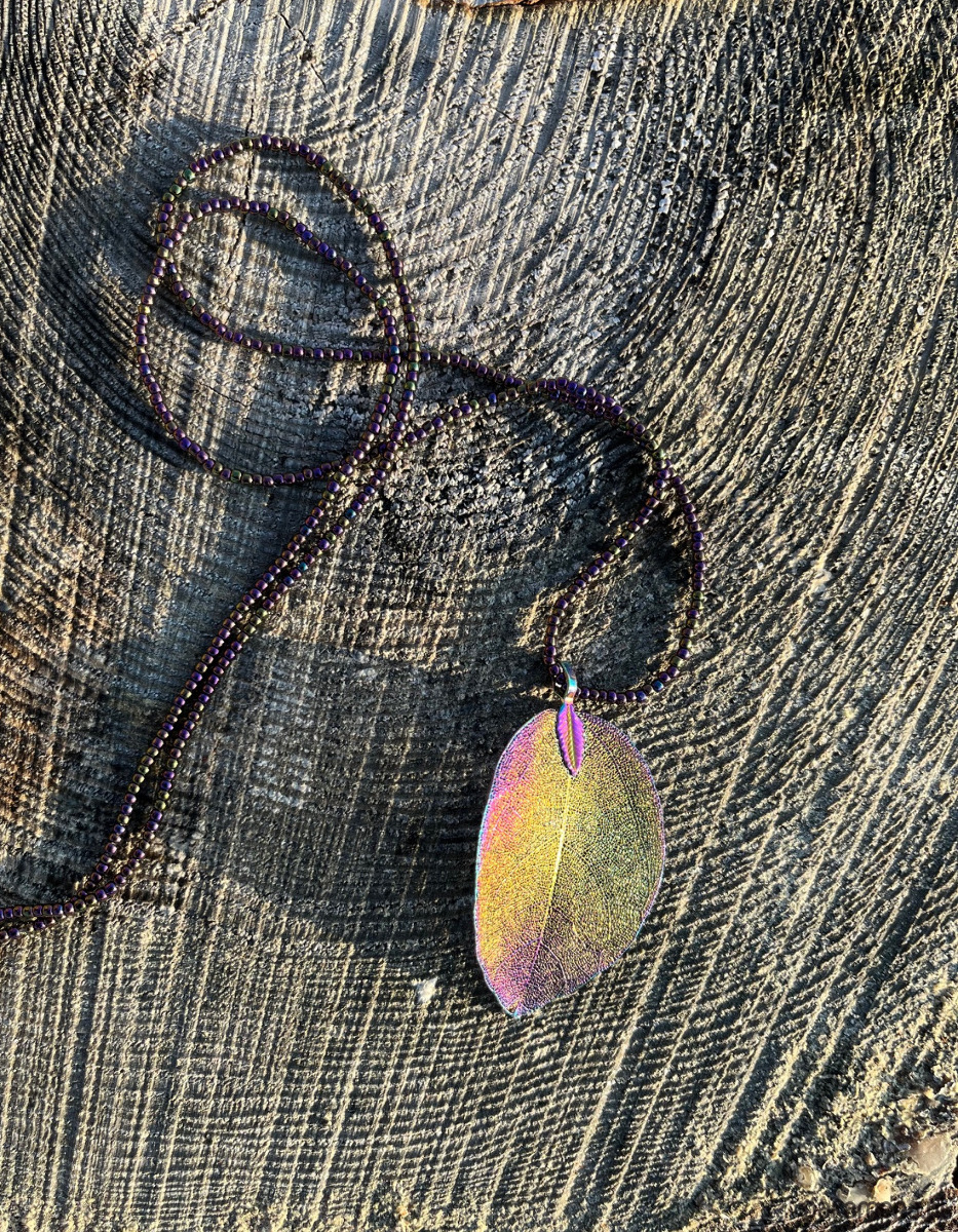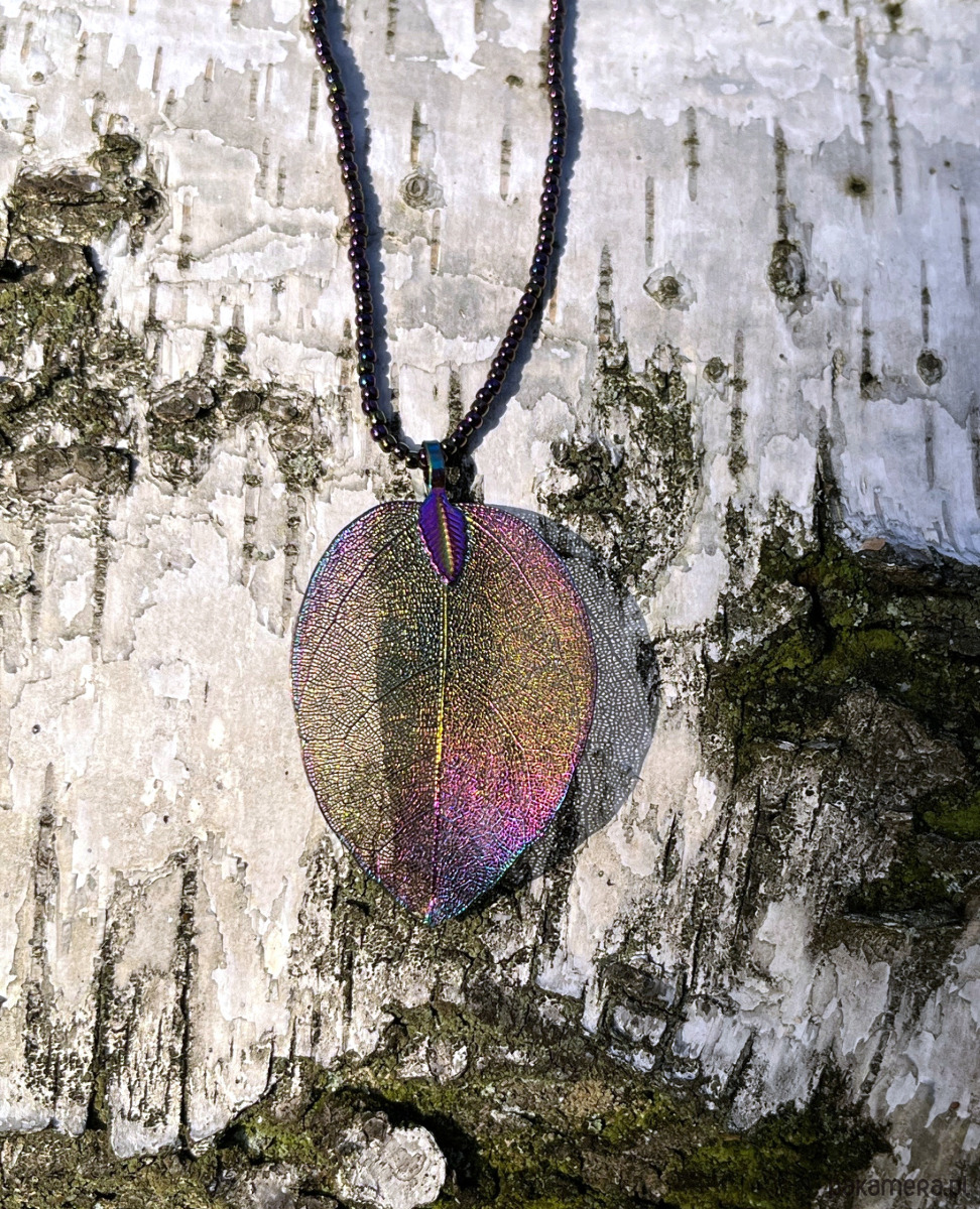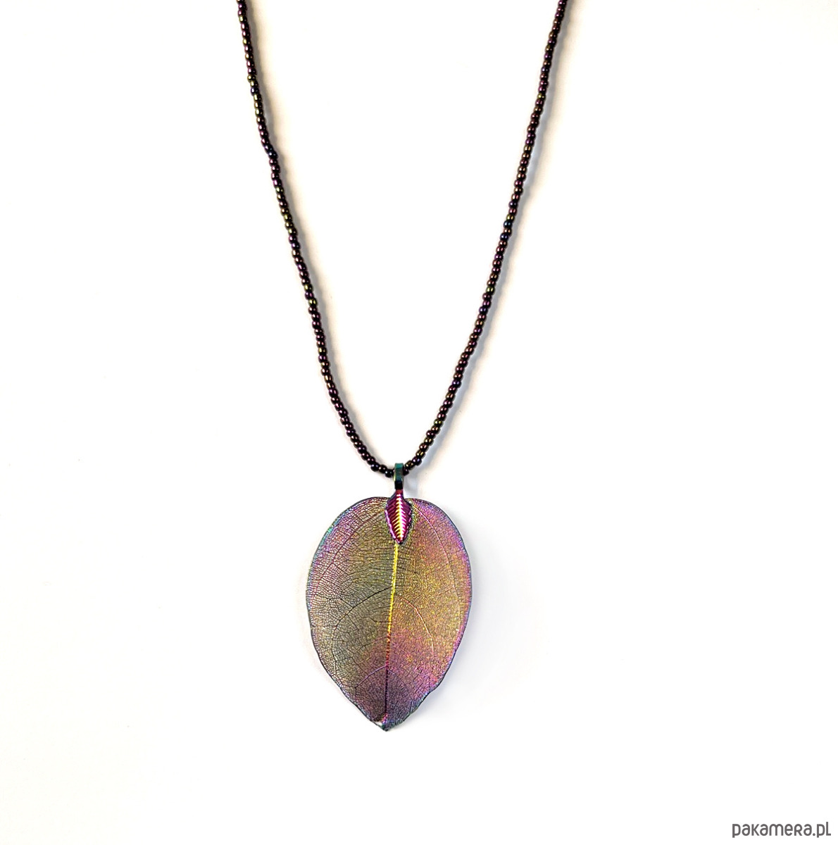 Naszyjnik, którego dominującym elementem jest opalizujący ażurowy liść z metalu. Liść wykonany jest z naturalnego liścia, dlatego zachowuje jego unikatowy, niepowtarzalny charakter. Liść zawieszony jest na sznurze z niewielkich szklanych koralików lśniących w promieniach światła. Ozdoba jest niezwykle lekka i delikatna, ale zdecydowanie przyciąga uwagę. Długość liścia ( bez zawieszki ) około 5 cm, długość sznura koralików 65 cm. Ozdoba do zakładania przez głowę, bez zapięcia.