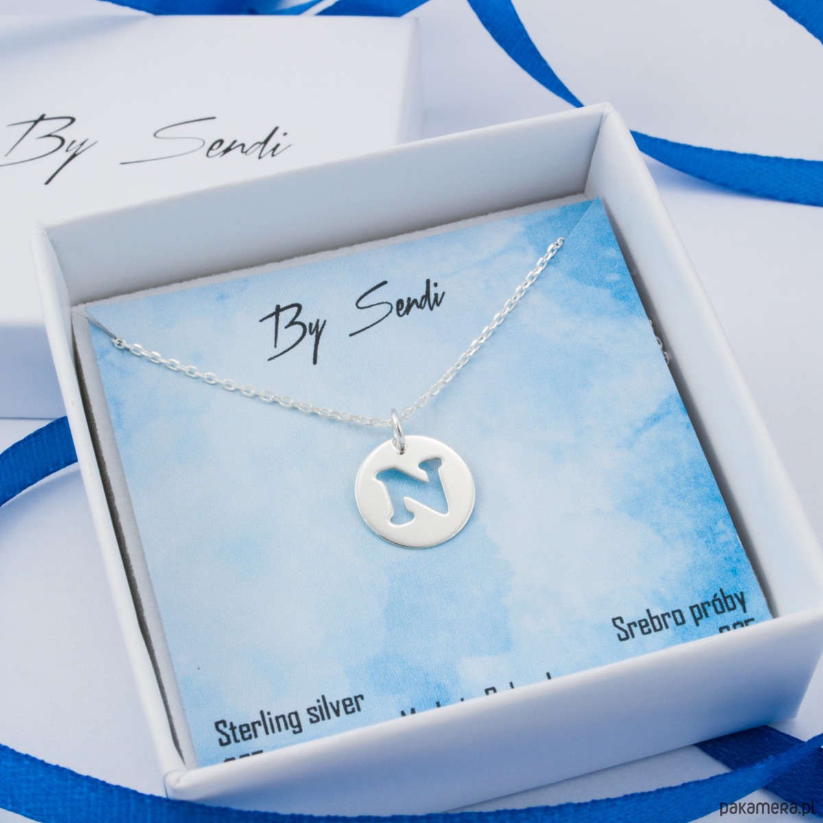 Naszyjnik upięty jest na kolorowym kartoniku oraz zapakowany w pudełko prezentowe widoczne na zdjęciu powyżej.