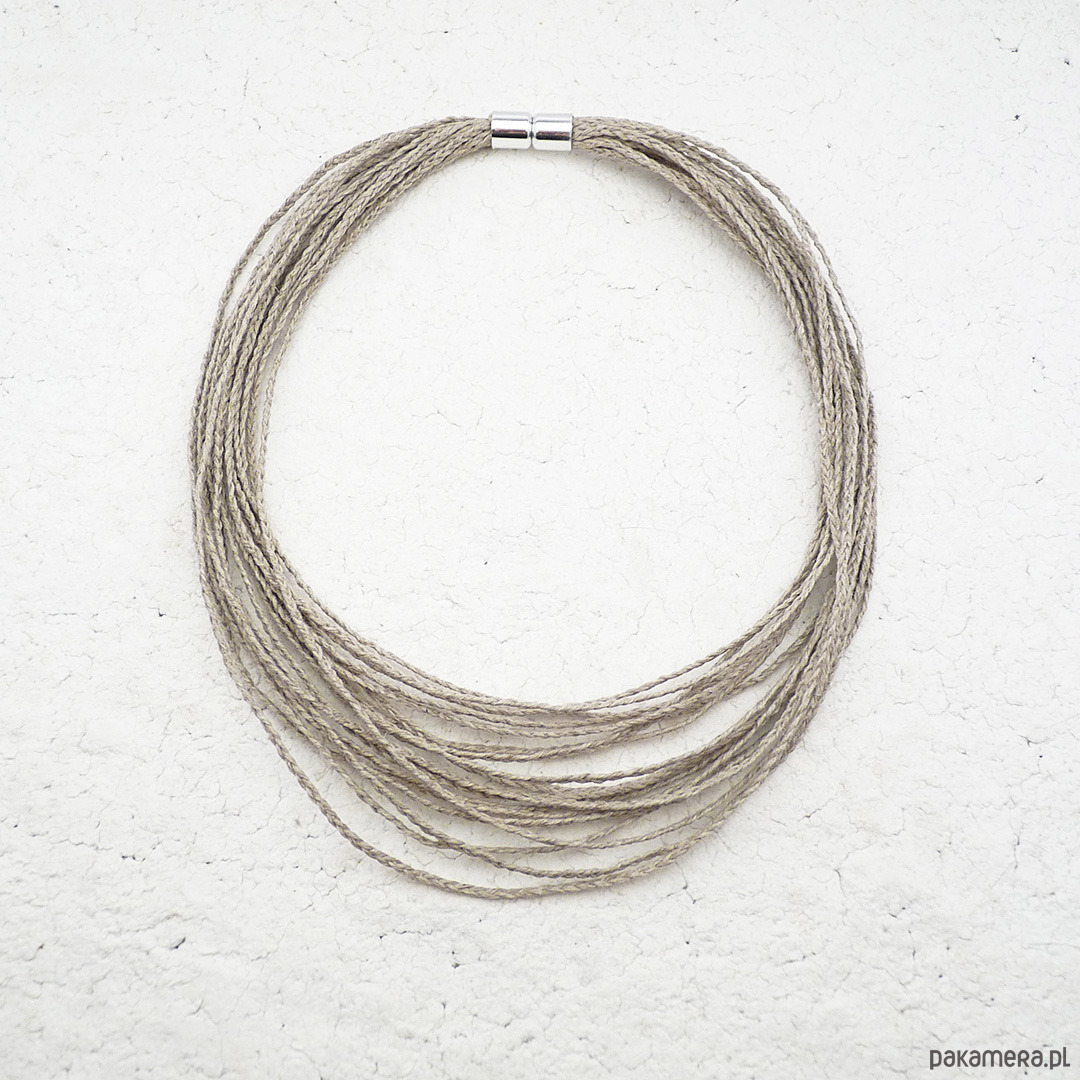 Naszyjnik jest wypleciony z pojedynczy nitek naturalnego lnu